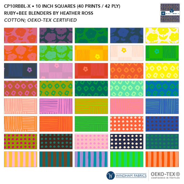 This precut bundle includes 42 squares (10" x 10") from the Ruby + Bee Blenders collection.