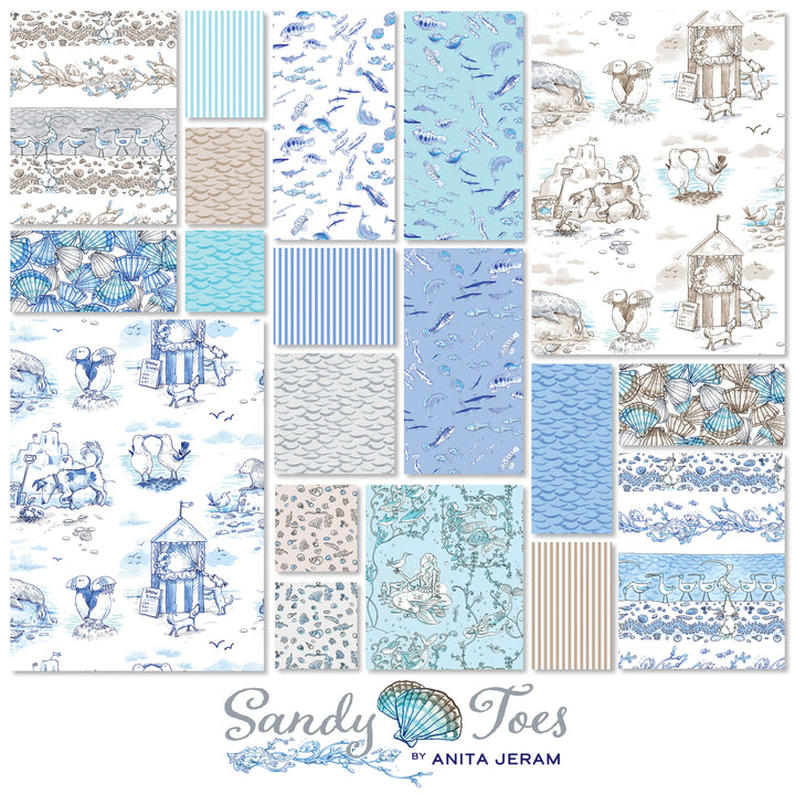 Explore the oceanside Sandy Toes collection from beloved illustrator Anita Jeram. Featuring mermaids, fish, sea lions, sand castles, shells and more. Shades of blue, grey, and taupe give these designs a classic and timeless feel. Perfect for quilting, apparel, or home decor.