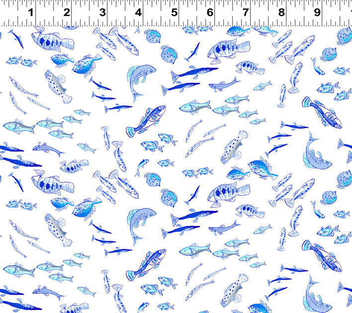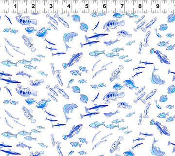 This print features blue and aqua fish scattered on a white background. 100% Cotton. 43/44" Wide.
