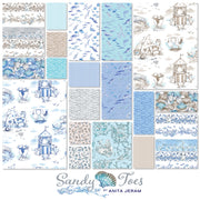 Explore the oceanside Sandy Toes collection from beloved illustrator Anita Jeram. Featuring mermaids, fish, sea lions, sand castles, shells and more. Shades of blue, grey, and taupe give these designs a classic and timeless feel. Perfect for quilting, apparel, or home decor.