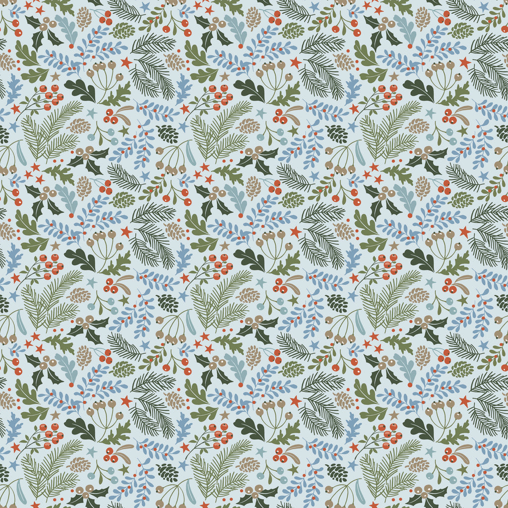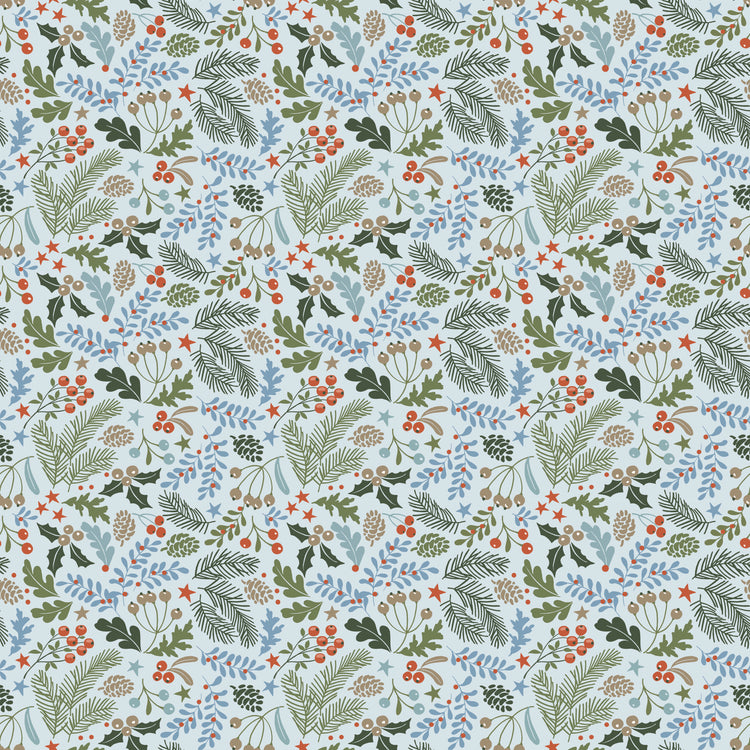 This timeless print features various evergreen branches, berries, and boughs with a sky blue background. The design captures the essence of a festive woodland with a mix of green, red, and brown elements, creating a cozy and festive atmosphere perfect for holiday projects. The pattern is detailed with small stars and various types of foliage, making it ideal for creating unique seasonal decorations or apparel.