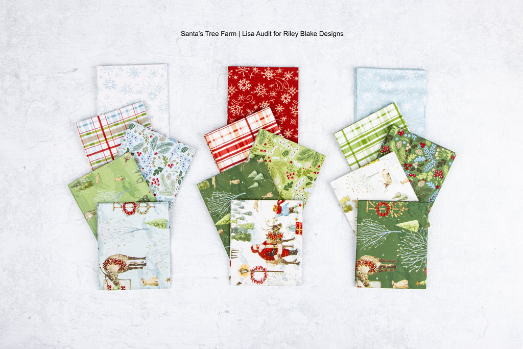 This enchanting fabric design captures the festive spirit of Santa's Tree Farm, featuring a snowy landscape filled with holiday cheer. The scene includes Santa Claus, reindeer, children, and woodland creatures all engaging in winter activities. Key elements like the "Reindeer Tours" sign, Christmas trees, and festive decorations like wreaths and presents add to the holiday ambiance. The playful and detailed illustrations create a warm, inviting atmosphere perfect for holiday crafting and decorating.