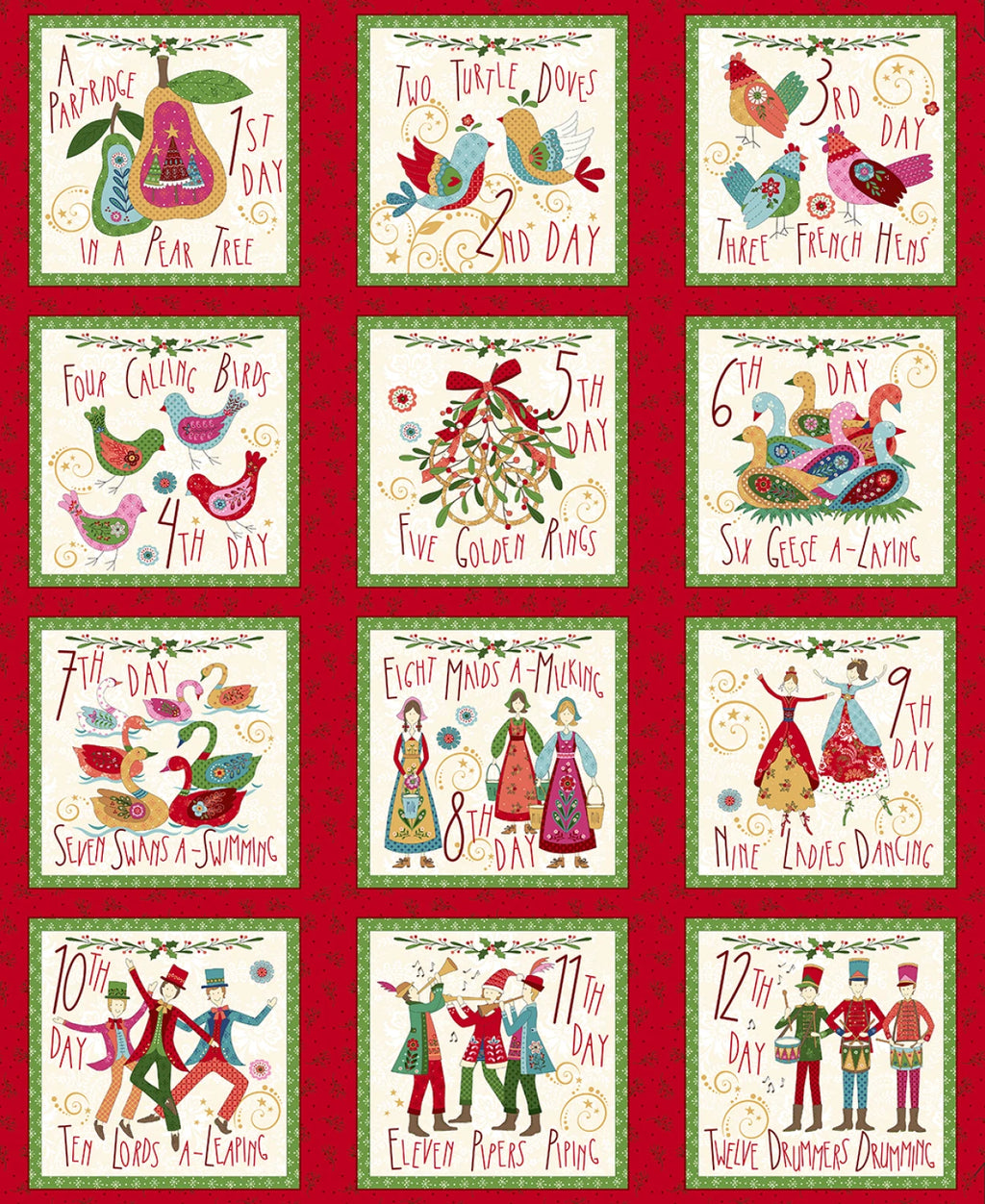 This 36" × 44" panel features twelve 10" × 10" blocks, each showcasing one of the beloved verses from the “12 Days of Christmas,” reimagined in a charming Scandinavian folk-art style. Classic red, green, and cream tones highlight the intricate details — from the partridge in a pear tree to the twelve drummers drumming — making each block a small work of art. Perfect for fussy cutting, these blocks can be turned into festive throw pillows, a holiday banner, or incorporated into quilts and table décor. With its versatile design and timeless appeal, this panel makes it easy to add a handcrafted Nordic touch to your Christmas projects.