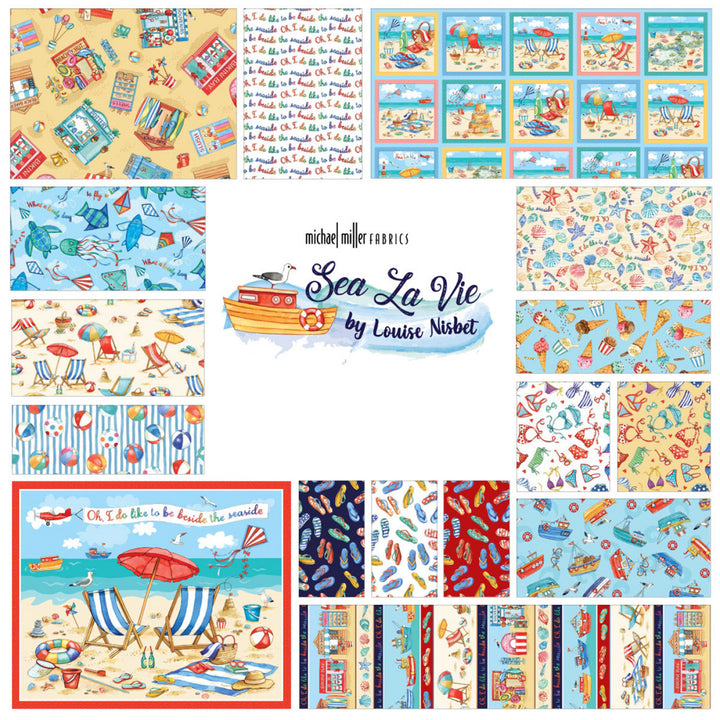 The "Sea La Vie" collection from Michael Miller captures the breezy charm of beach life with its serene nautical motifs and coastal elements. Sailboats, sea creatures, and sandy shores come alive in a palette of blues, neutrals, and coral. Designed by Louise Nisbet, this collection showcases her signature style, blending whimsical illustrations with a natural elegance that perfectly encapsulates the beauty of seaside living. Ideal for creating beach-themed quilts and decor, "Sea La Vie" brings the ocean's tranquility into your projects.