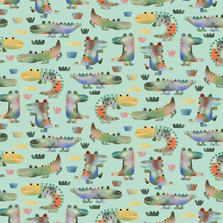 This fun allover print from the See Ya Later Alligator collection by Michael Miller Fabrics features colorful alligators and scattered plants on a fresh mint background. Printed on 100% cotton, it’s perfect for children’s quilts, novelty sewing, and jungle or safari-themed décor.