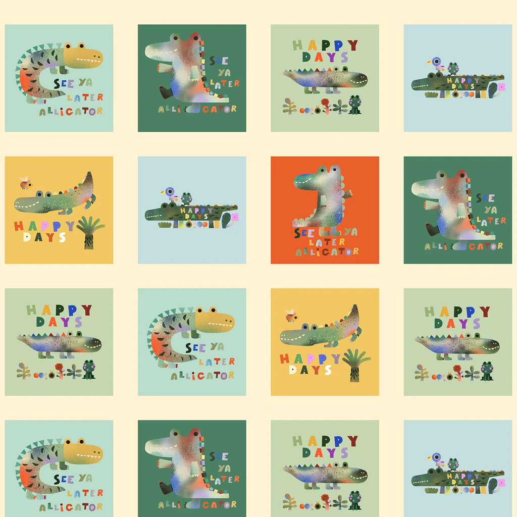 This playful patch print from the See Ya Later Alligator collection by Michael Miller Fabrics features rows of colorful 4.5" squares with cheerful gators, critters, and sayings like “Happy Days” and “See Ya Later Alligator.” Printed on 100% cotton, this running yardage is perfect for fussy cutting, quilt accents, and kids’ projects. Each 1/2 yard cut provides 4 complete rows of blocks, with individual squares measuring approx. 4.5".