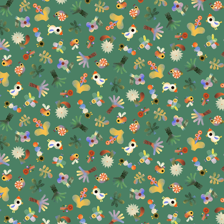 This lively coordinate from the See Ya Later Alligator collection by Michael Miller Fabrics showcases birds, bees, flowers, and trees scattered across a rich green background. Printed on 100% cotton, it’s a playful choice for children’s quilts, novelty sewing, and nature-themed décor.