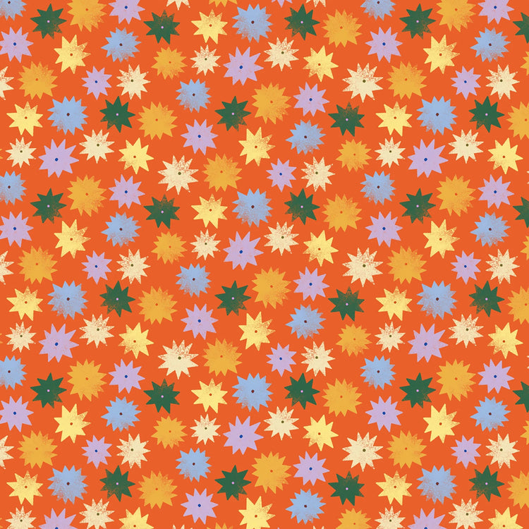This bold coordinate from the See Ya Later Alligator collection by Michael Miller Fabrics features scattered multicolor starburst shapes against a vibrant orange background. Printed on 100% cotton, it adds a playful geometric pop to children’s quilts, novelty projects, and modern décor.
