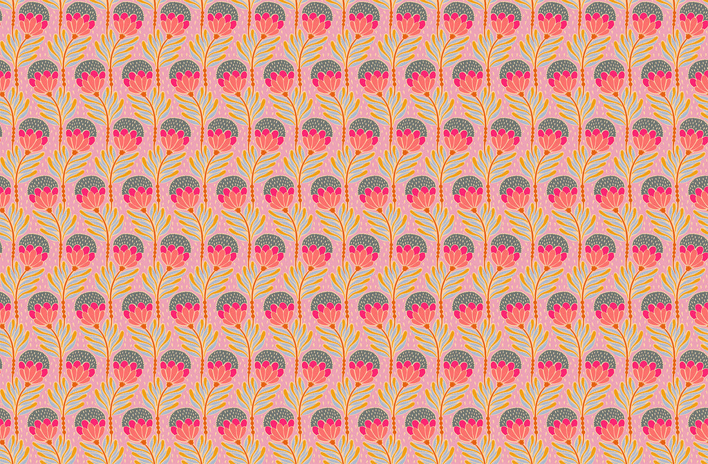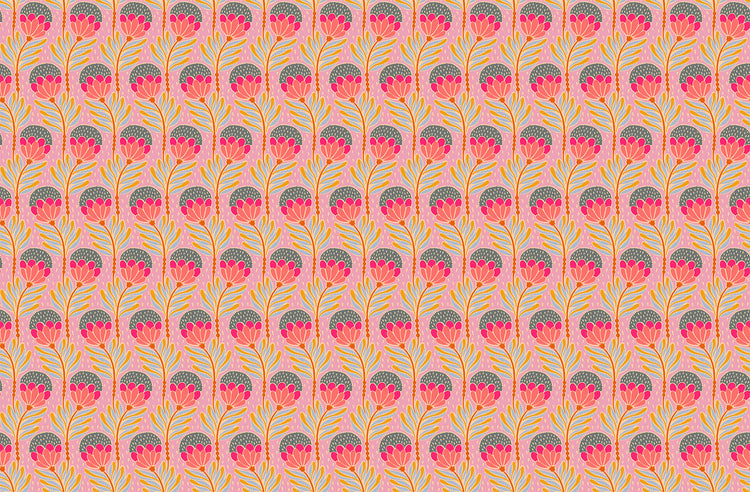 This moody-yet-lively floral features rich coral-pink blooms and golden stems set against a soft mauve-pink background, with dotted charcoal halos adding depth and contrast. The layered shapes and subtle textural details create movement without overwhelming. A beautiful way to bring warmth and structure into more atmospheric color palettes.
