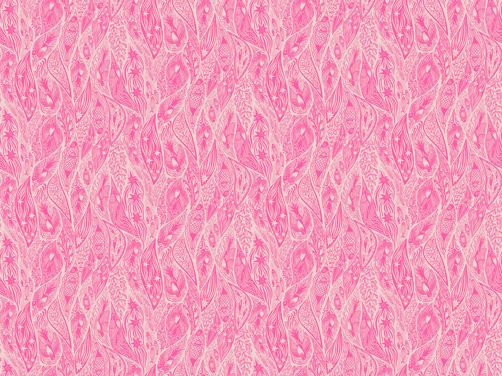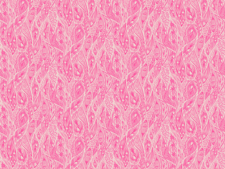 A dreamy tangle of birds, flowers, shooting stars, and fish glides across this vivid tonal print in rich pinks and warm corals. The hand-drawn linework sways like water or wind, giving the design a sense of movement and magic. Detailed yet soft, it brings storybook charm to any project.