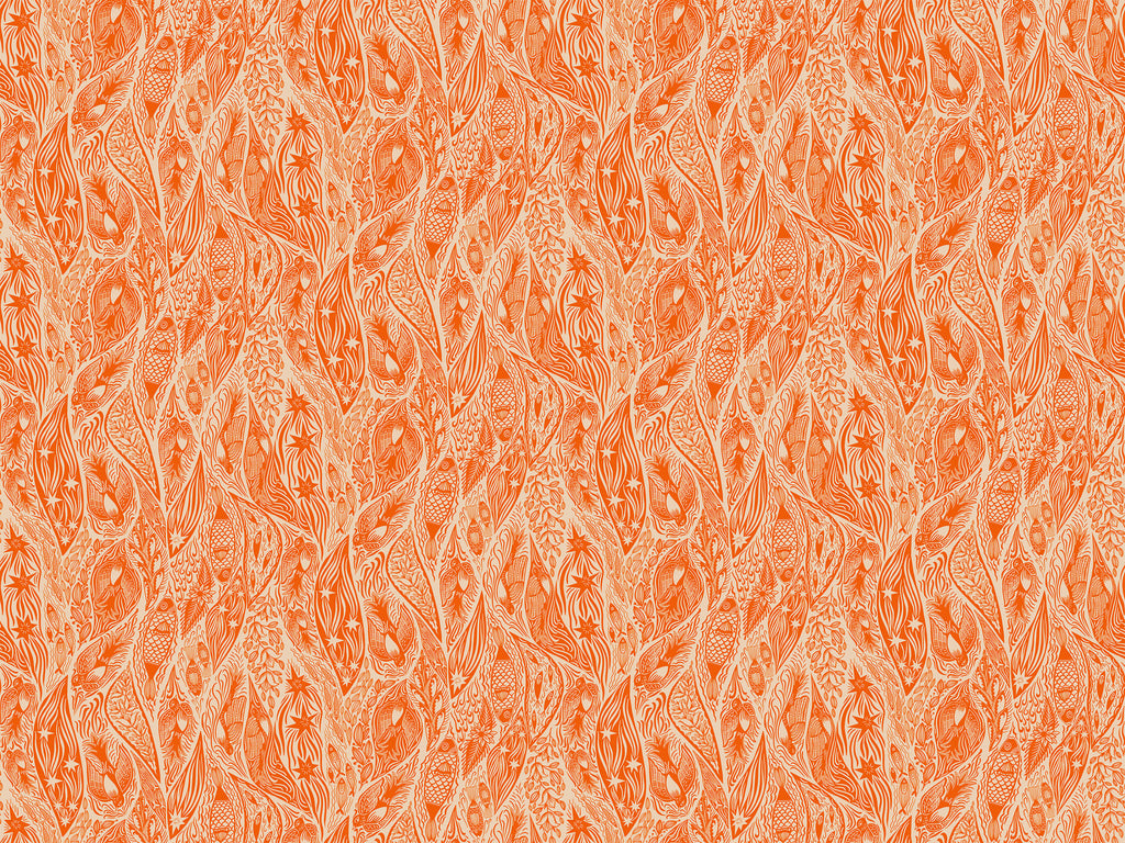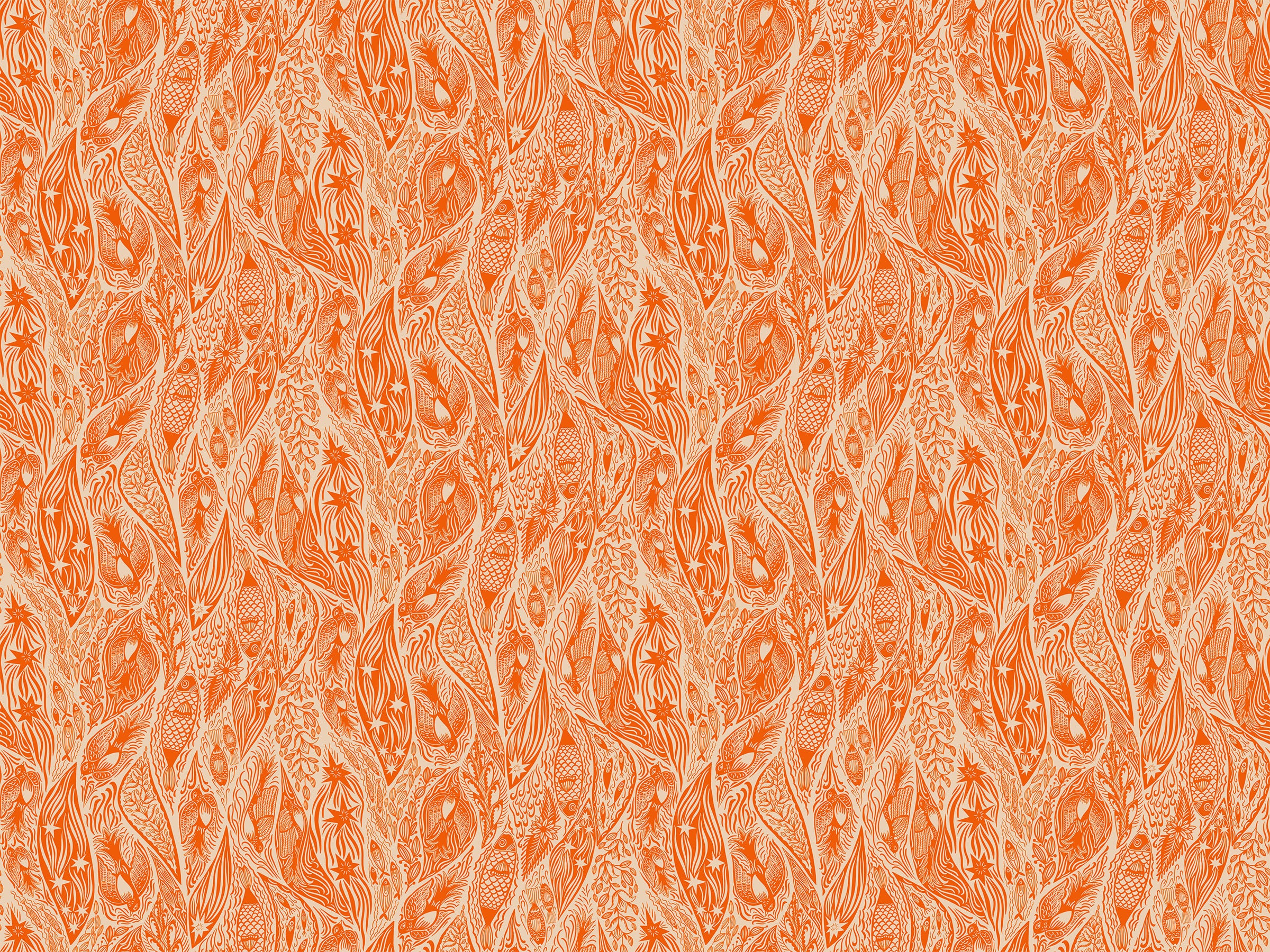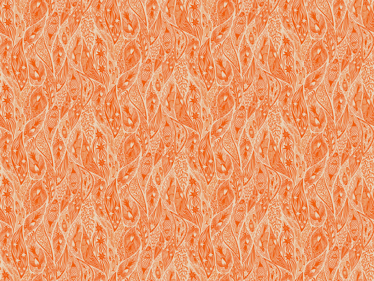This bold orange-on-cream tonal print bursts with energy. Shooting stars, soaring birds, and wave-like florals curve across the fabric in a striking natural rhythm. The high contrast gives it a retro pop, while the organic motifs keep it grounded in nature.