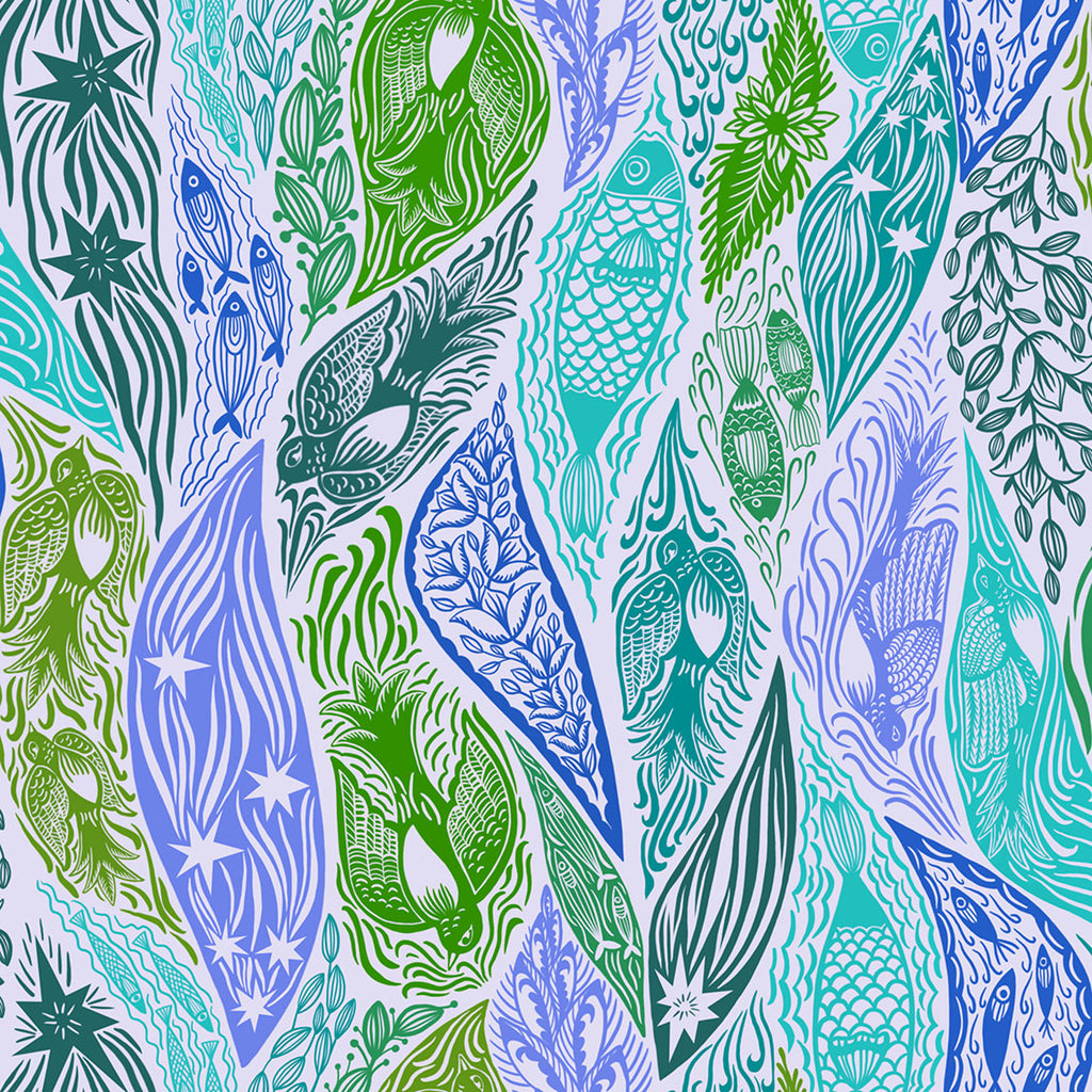 Cool tones of teal, blue, and seafoam bring a refreshing calm to this beautifully illustrated 108" wide backing. With woodcut-style details of fish, birds, stars, and flowing leaves, this print captures a natural rhythm and movement, ideal for adding visual texture to the back of any quilt project.