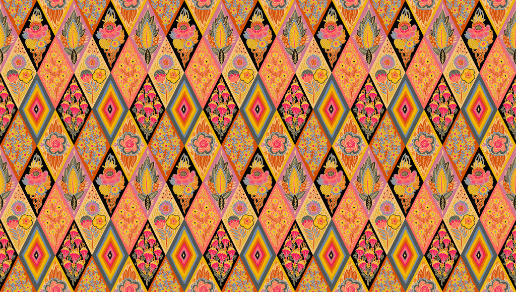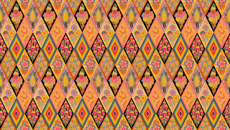 A striking patchwork-style print featuring alternating diamonds filled with ornate florals, stylized leaves, and vibrant color bursts in bold reds, golds, pinks, and black. This dramatic layout gives the feel of a pre-pieced quilt.
