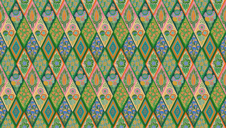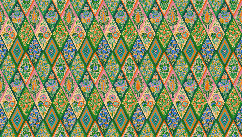 Lush greens and soft golds meet rich purple and tangerine in this dynamic diamond print filled with stylized florals and foliage. The bold harlequin layout creates a rhythmic, quilt-like effect with just the right balance of structure and playfulness. A great choice when you want your project to feel vibrant, organic, and full of life.