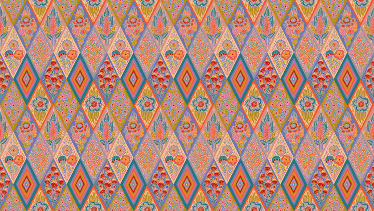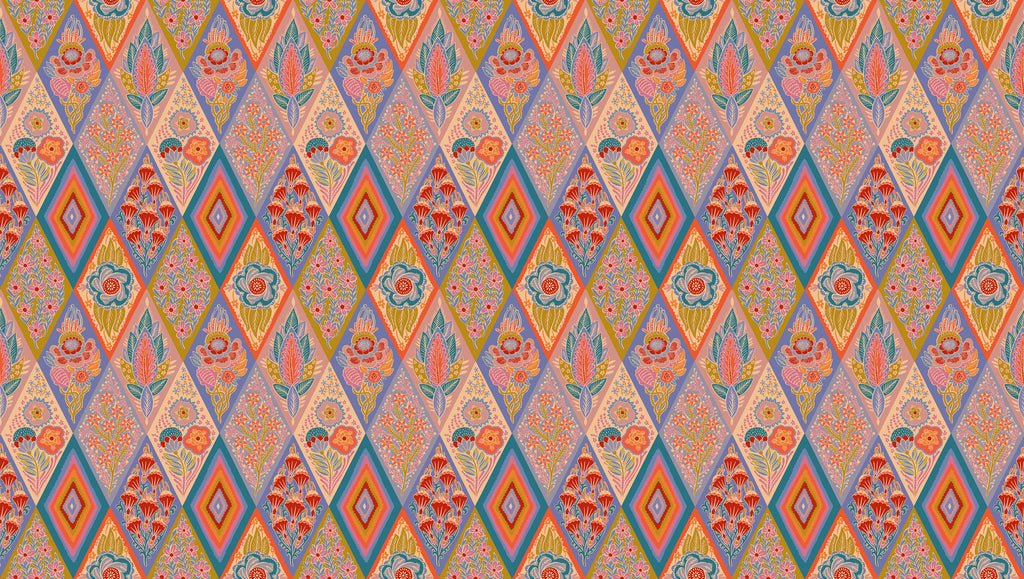A mesmerizing diamond layout filled with layered florals, etched leaves, and ornamental details in deep teal, violet, coral, and golden ochre. The symmetrical design feels both classic and fresh, offering rich movement and painterly texture that glows with 1960s-inspired color.