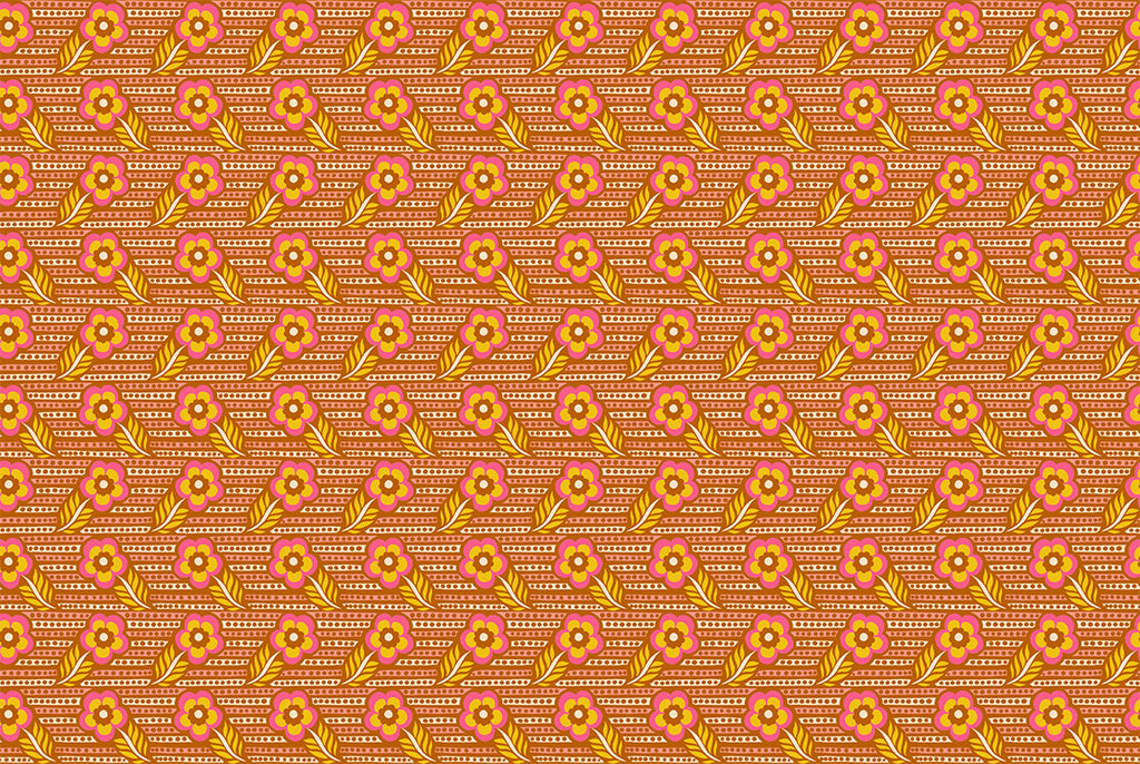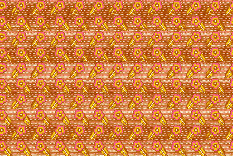 This lively folk-inspired floral print features stylized orange and pink blossoms lined up in tidy diagonal rows across a warm caramel background. Yellow-gold leaves and graphic dotted lines add structure, giving the design a retro feel with a rhythmic, almost stripe-like flow. A playful yet balanced print, perfect for adding a touch of vintage charm to your projects.