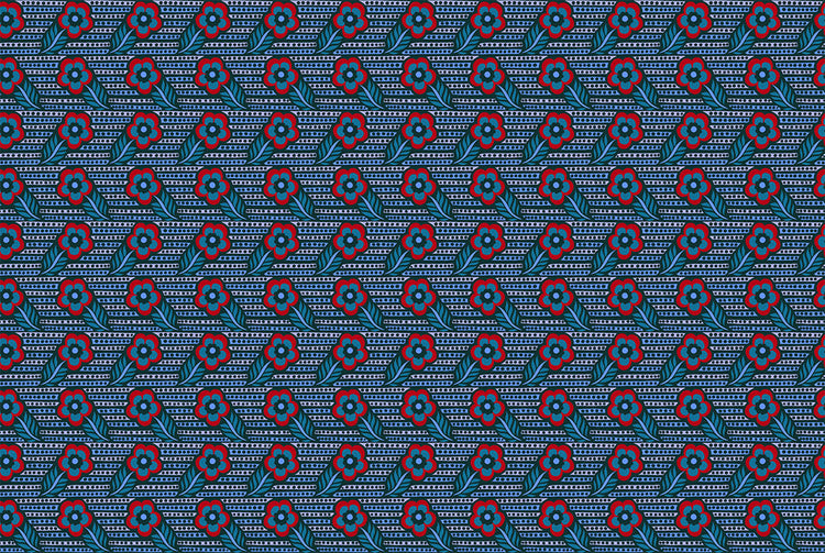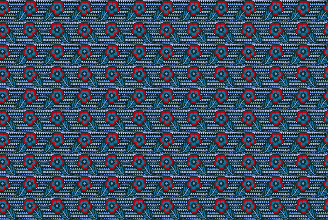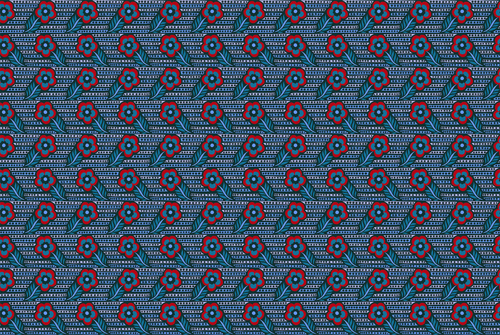 Rich indigo sets the tone for this folk-style floral, where rows of teal leaves and vibrant red flowers pop against a field of linear dots. The design has a structured rhythm reminiscent of decorative woodblock prints, bringing bold contrast and old-world charm to modern or traditional quilts alike.