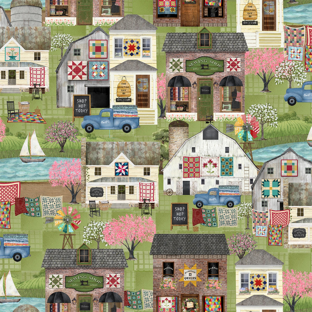 This illustrated townscape print features cozy quilt shops, barns, cottages, and trucks loaded with quilts, all set against a fresh green background with blooming trees and gentle countryside details. The repeating scene feels lively and story-driven, with plenty of charming moments that make it fun to look at and easy to showcase. A great choice for feature quilts, quilt backs, bags, and statement sewing projects. 100% cotton quilting fabric.