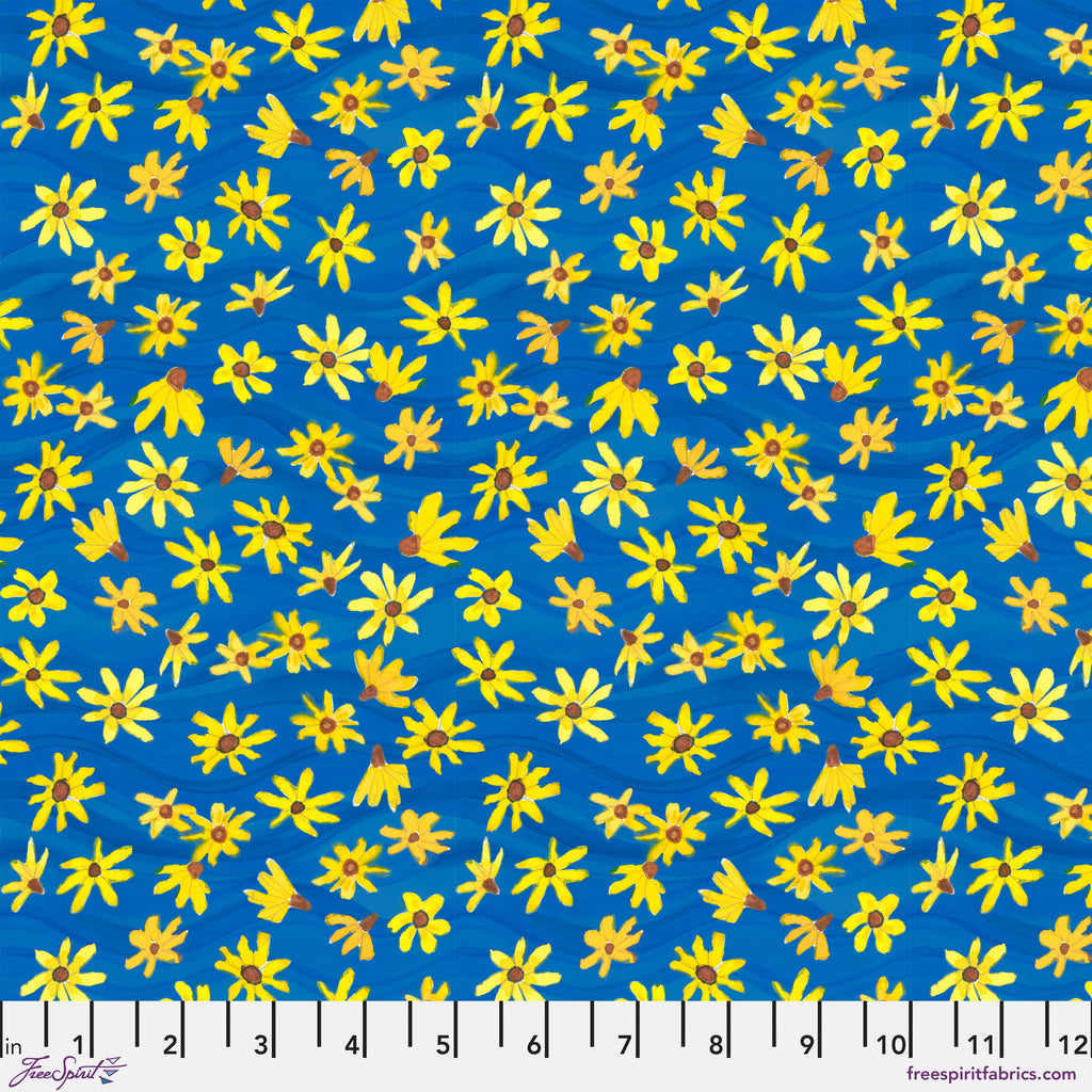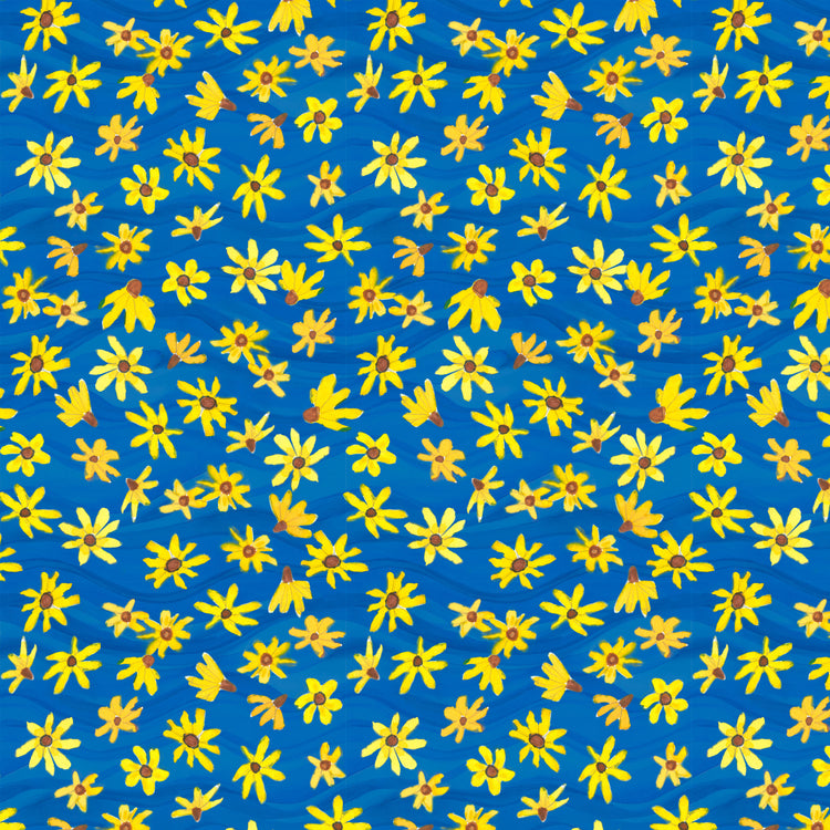 This vibrant 100% cotton print features a lively scatter of coneflowers in sunny hues of blue and yellow, capturing the cheerful essence of wildflower meadows in Sisters, Oregon. Ideal for quilting, apparel, and home décor projects, this fabric infuses a touch of nature's brilliance into your creations.