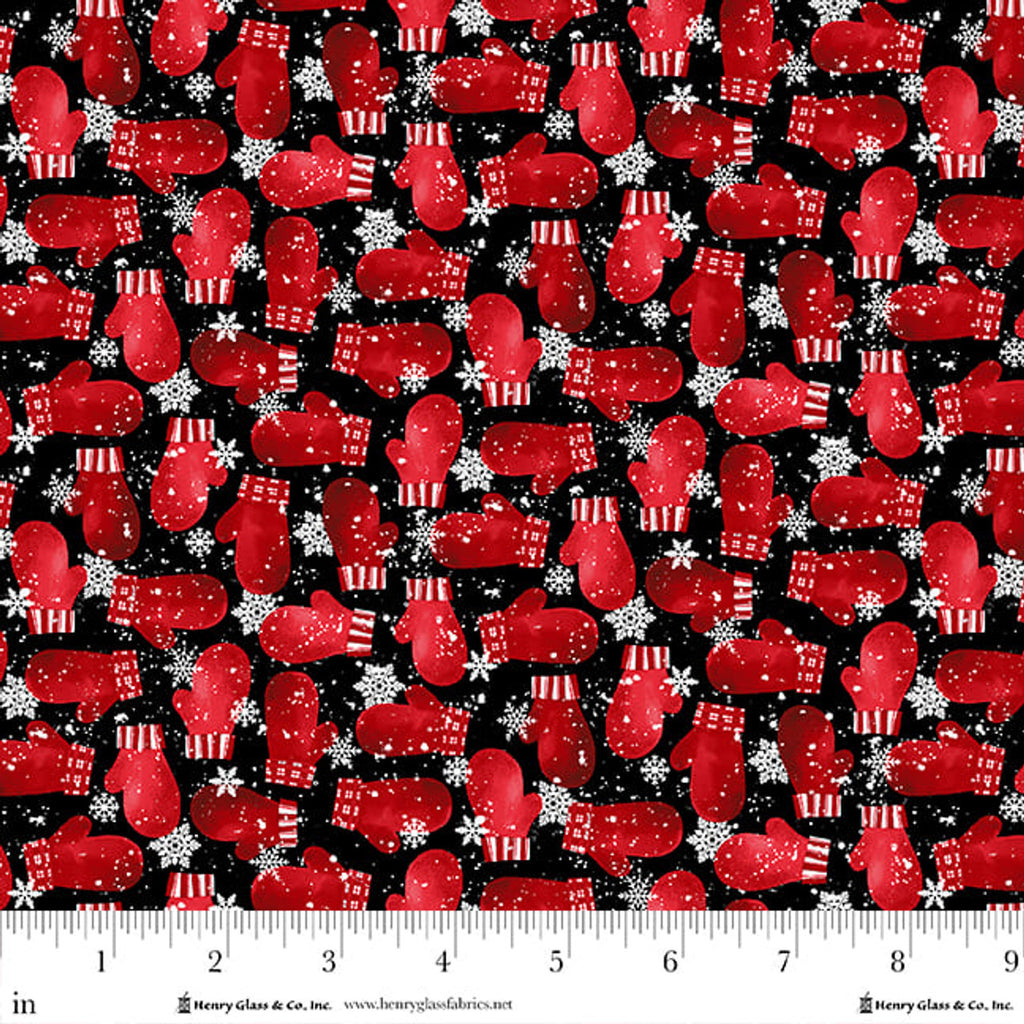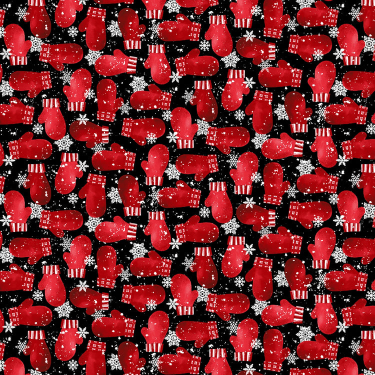 This playful winter flannel features bright red mittens scattered across a deep black background, accented by delicate white snowflakes for a fun seasonal contrast. The 4-inch repeat gives the print a lively, allover look that’s perfect for holiday quilts, cozy pajamas, pillowcases, and festive décor. Made from 100% cotton flannel, it offers a warm, soft feel ideal for cold-weather sewing. A charming novelty print that pairs well with the Snow Crew collection or adds a cheerful touch to any winter project.