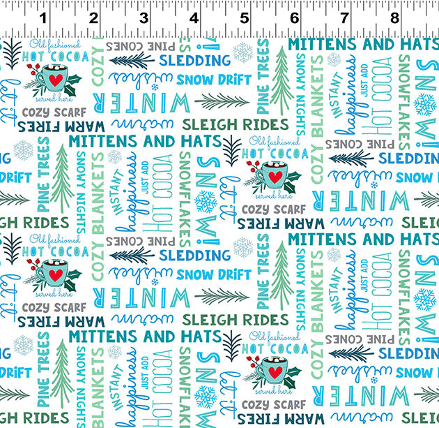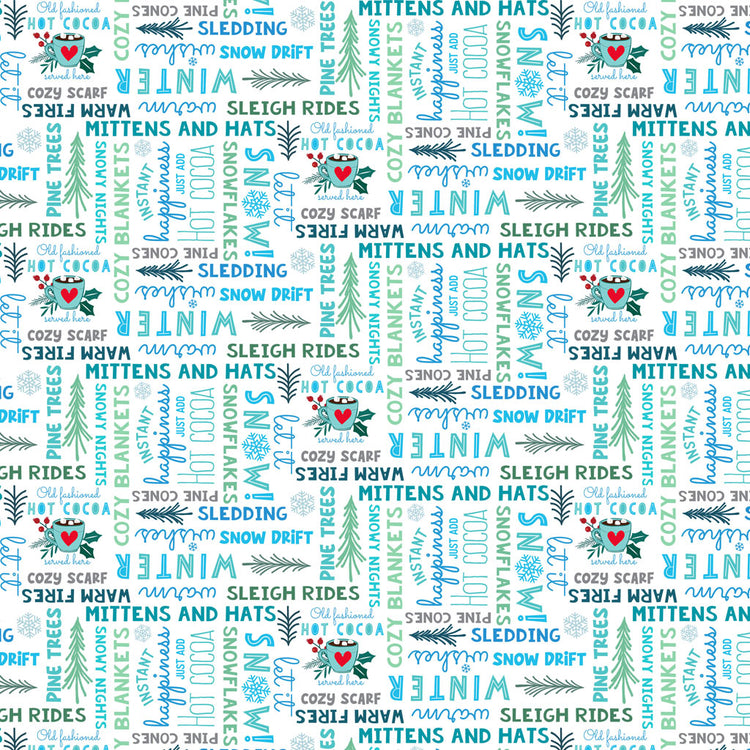 This digitally printed fabric features repeating winter-themed text and a cocoa-filled mug on a white background.