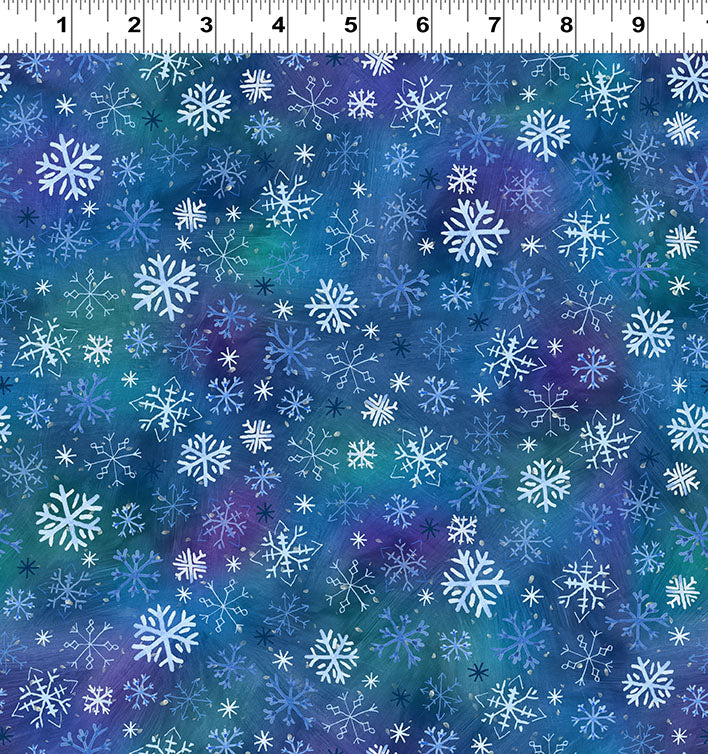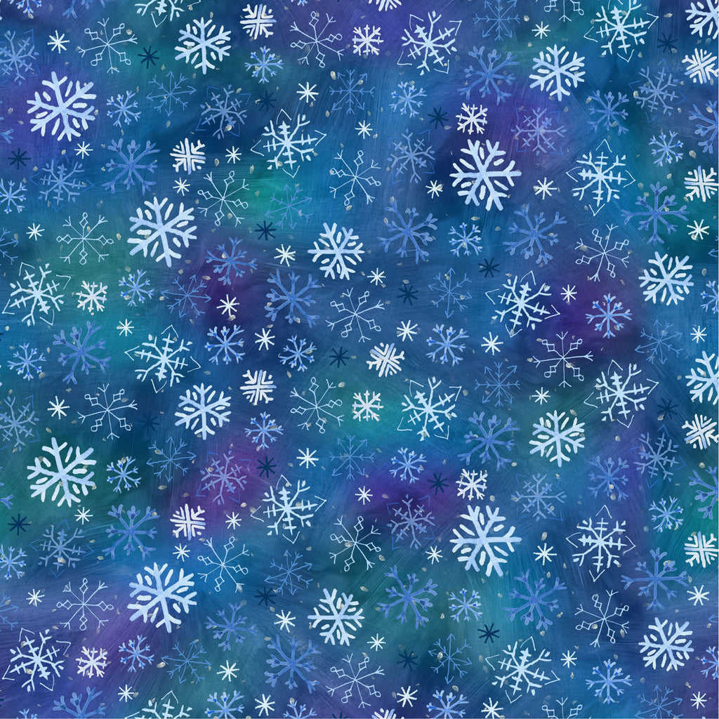 This digitally printed quilting cotton features delicate white and blue snowflakes scattered across a rich, watercolor-style background of blues, teals, and purples. Perfect for adding depth and a touch of winter magic, this print coordinates beautifully with the animal and tonal designs in the Snowtime collection. Ideal for quilts, table runners, or seasonal décor projects.
