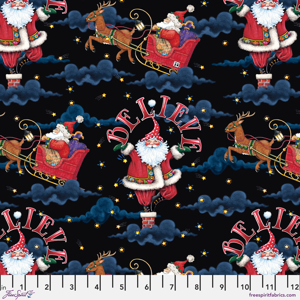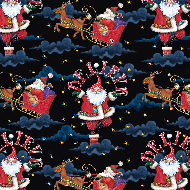 Bring the magic of Christmas Eve to your next project with this delightful feature print from So Much Joy!. Santa soars through a starry sky in his sleigh, while a second version of him pops out of a chimney beneath the bold word “BELIEVE.” Set on a rich black background with soft cloud details and twinkling stars, this print is ideal for fussy cutting or as the focal point of a festive quilt, wall hanging, or holiday throw pillow. It captures all the nostalgia and wonder of waiting for Santa.