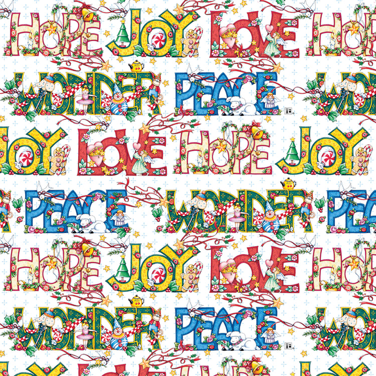 Celebrate the season with this vibrant allover print featuring hand-drawn words like JOY, LOVE, HOPE, PEACE, and WONDER. Each word bursts with festive charm, decorated with Mary Engelbreit’s signature characters, holly, stars, and Christmas toys. This print has a joyful, collage-style layout—ideal for backing quilts, holiday bags, and seasonal home decor. It’s a statement piece with meaning and whimsy in every inch.