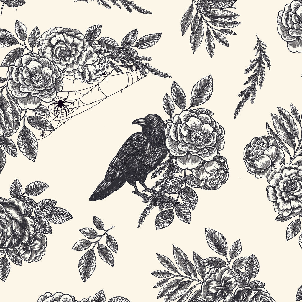 This print features ravens and clusters of flowers and leaves. It's 107"/108" wide to accommodate most quilt backs. Machine wash cold / tumble dry low.