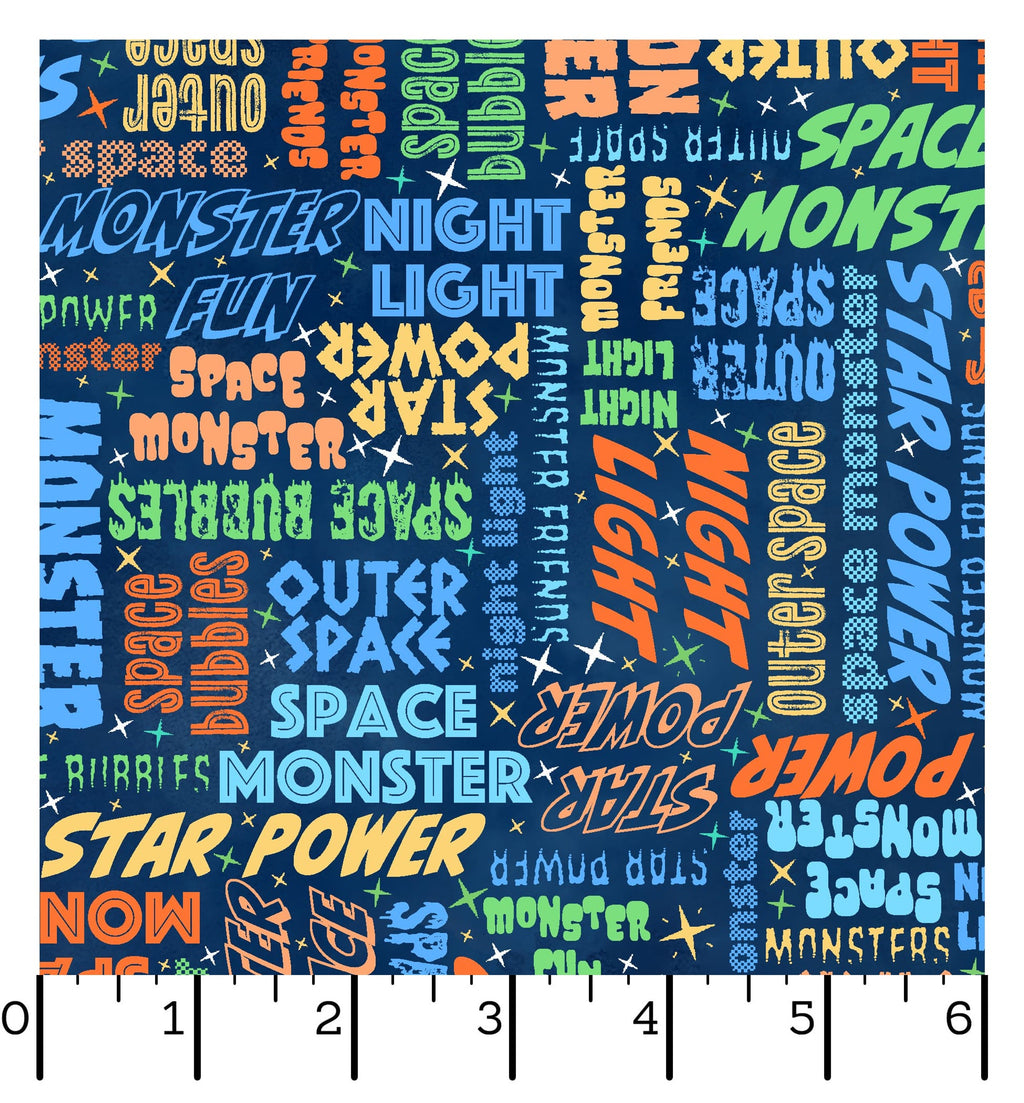 This vibrant fabric features a playful and energetic design with words like 'MONSTER', 'SPACE', 'POWER', 'FUN', and 'NIGHT' scattered across a dark navy background. The words are presented in various bold, bright colors including orange, blue, green, and pink, creating a lively contrast that appeals to both children and adults. Ideal for projects that require a fun and dynamic look, this fabric's unique pattern makes it perfect for creating standout apparel, accessories, or home decor items.