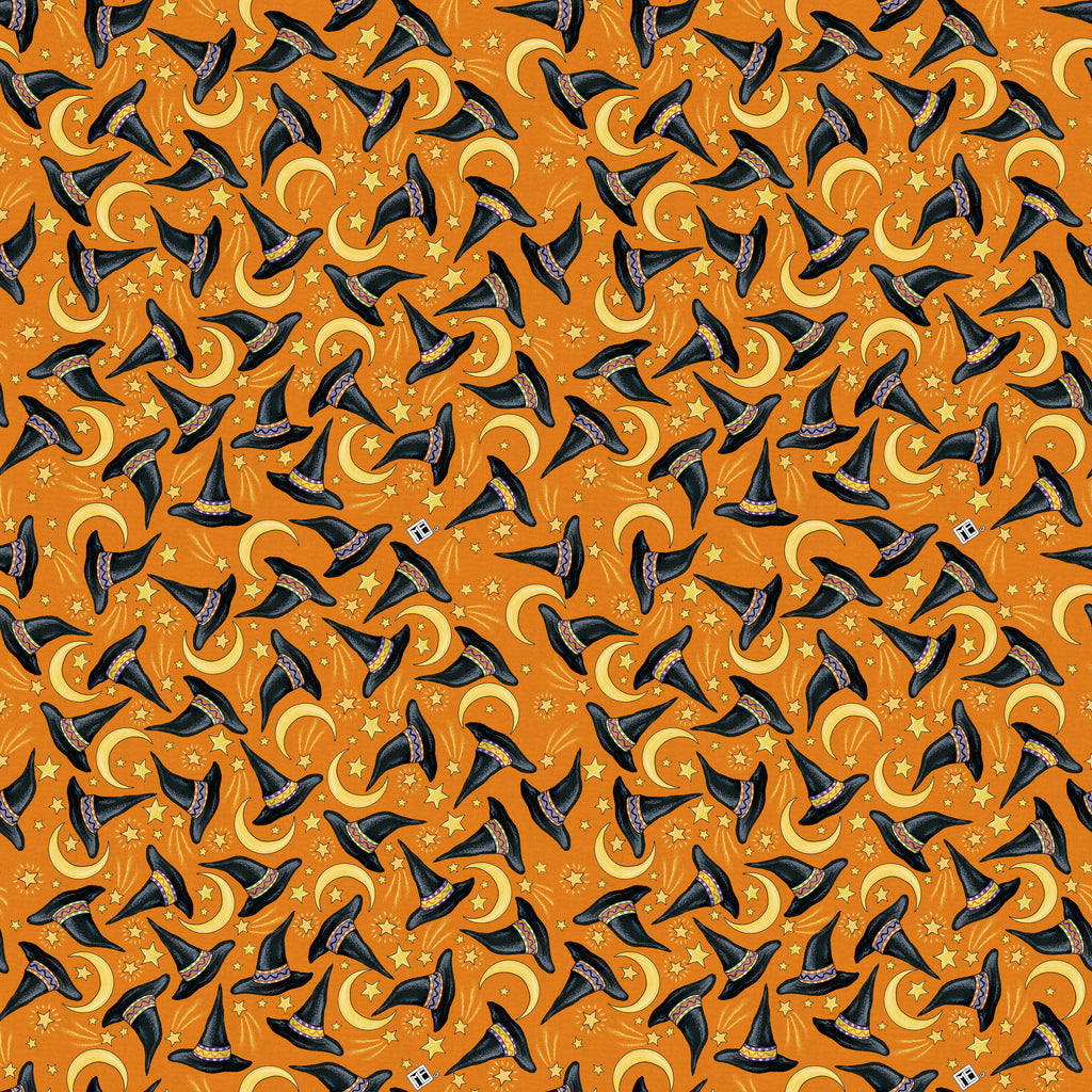 This 100% cotton fabric from Mary Engelbreit’s Spooky Cute Halloween collection features tossed witch hats, crescent moons, and stars sparkling across a rich orange backdrop.