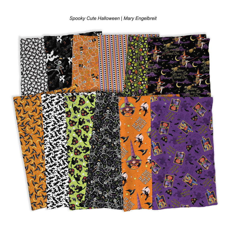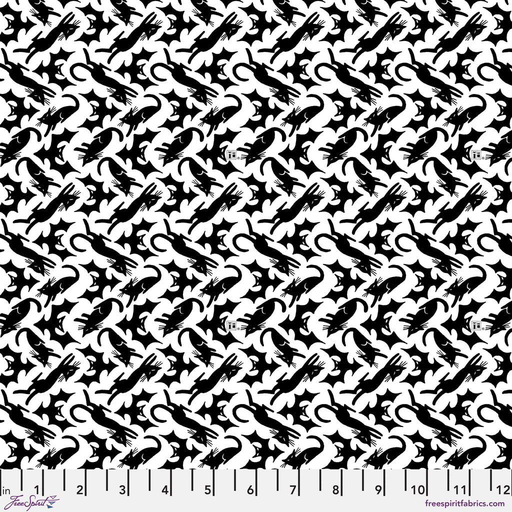 Cat Scatter from Mary Engelbreit’s Spooky Cute Halloween collection is a striking black-and-white print that captures the classic Halloween vibe with a touch of whimsy. Featuring high-contrast silhouettes of startled black cats and bats in playful poses, this print creates a dynamic, allover pattern that’s both spooky and stylish. Ideal for bold backgrounds, borders, or standalone projects, it adds a crisp, graphic edge to your festive sewing.