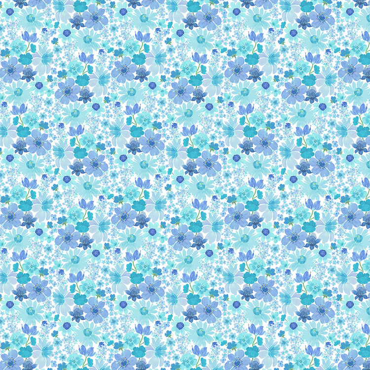 Blue Small Floral by Heatherlee Chan for Clothworks features a dense scatter of softly painted blossoms in layered shades of blue, teal, and aqua on a light background. The smaller scale and watercolor style give it gentle movement and make it easy to use as a supporting floral without overwhelming other prints. Printed on 100% cotton quilting fabric, it works beautifully for spring quilts, patchwork, and coordinating backgrounds.