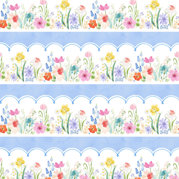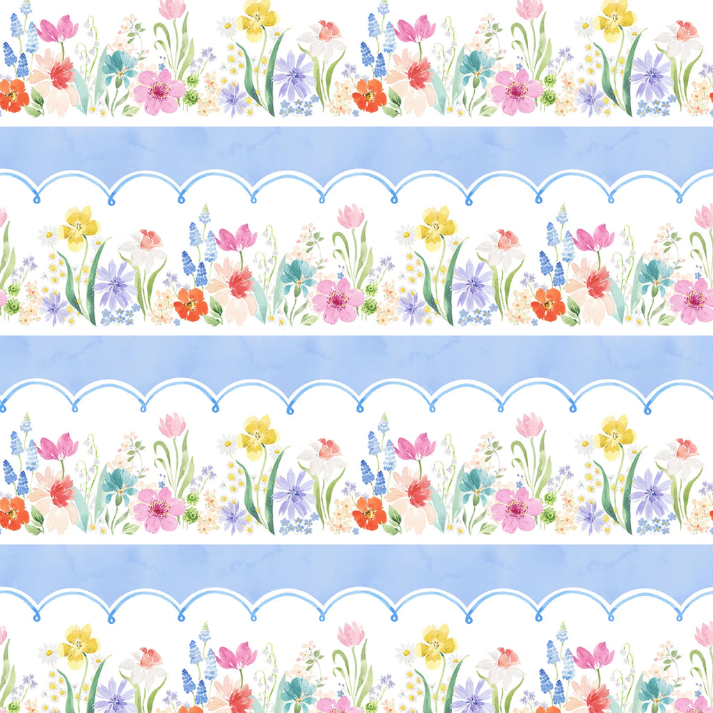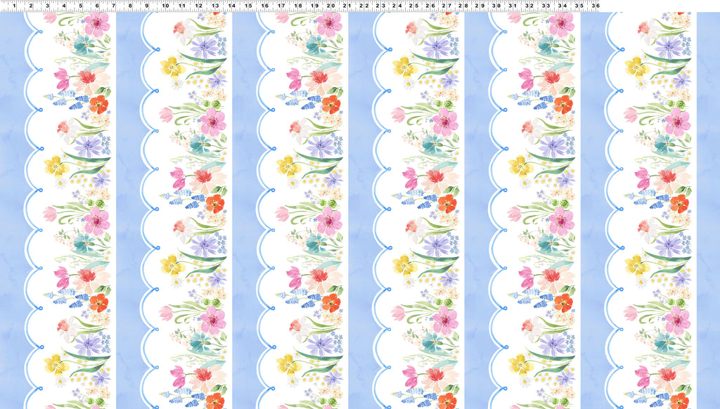 Light Denim Pictorial Stripe by Heatherlee Chan for Clothworks features softly painted rows of spring florals framed by scalloped white bands on a gentle denim-blue background. The repeating stripe layout gives the print a decorative, border-style look that works especially well for quilt borders, sashing, table runners, and statement accents. Printed on 100% cotton quilting fabric, it brings a light, airy feel to spring and seasonal sewing.