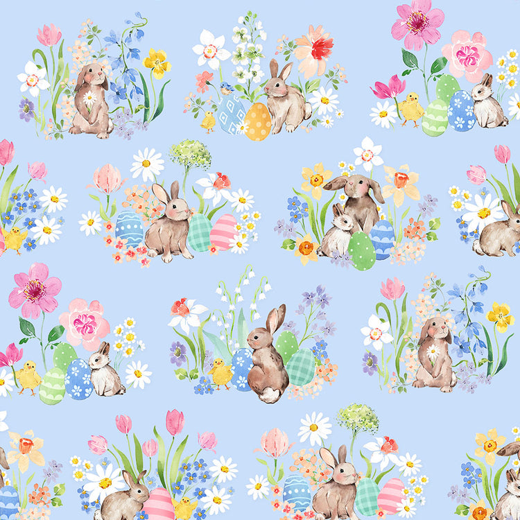 Light Denim Toile by Heatherlee Chan for Clothworks features sweet watercolor vignettes of bunnies, chicks, flowers, and decorated eggs scattered across a soft denim-blue background. The open layout gives each scene room to shine while keeping the overall look light, playful, and easy to sew with. Printed on 100% cotton quilting fabric, it’s a charming choice for baby quilts, spring projects, and seasonal patchwork with a gentle storybook feel.