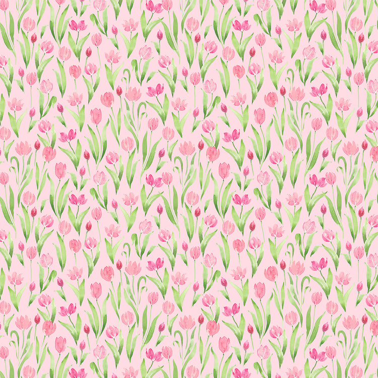 Light Pink Tulips by Heatherlee Chan for Clothworks features softly painted pink tulips and fresh green leaves scattered across a pale blush background. The watercolor style gives the print a gentle, airy feel with natural movement that reads sweet without being overly busy. Printed on 100% cotton quilting fabric, it’s a lovely choice for baby quilts, spring projects, and floral-focused patchwork.
