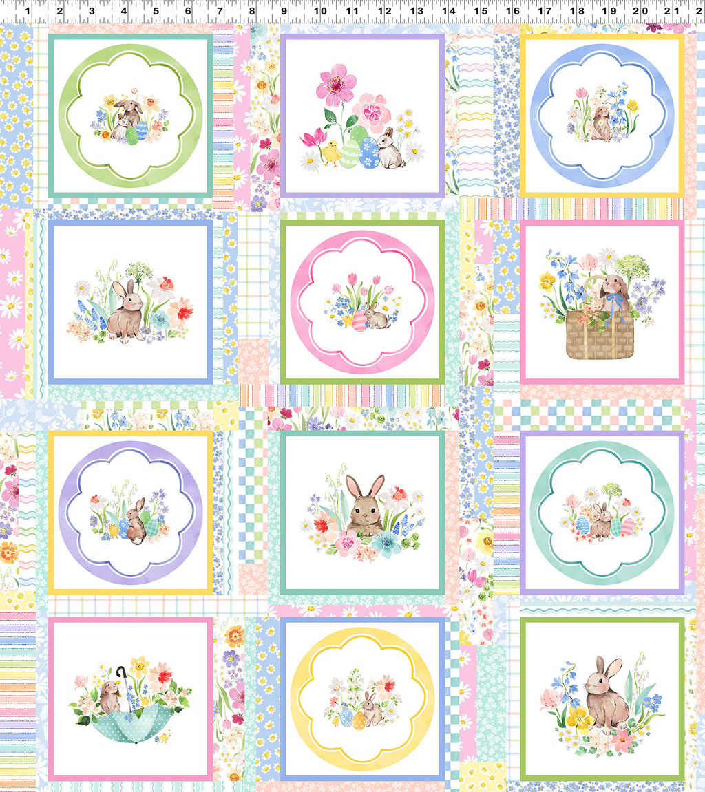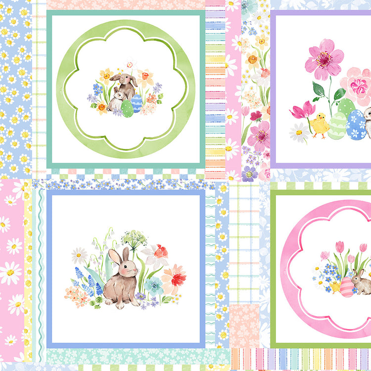 Multi Color Blocks by Heatherlee Chan for Clothworks features a patchwork-style layout of framed blocks showcasing sweet bunnies, chicks, flowers, and Easter eggs. The block-style design repeats continuously across the fabric and is sold as running yardage rather than a pre-cut panel, making it well suited for fussy cutting and flexible quilt layouts. Printed on 100% cotton quilting fabric, it’s a playful choice for baby quilts, Easter projects, and spring sewing.