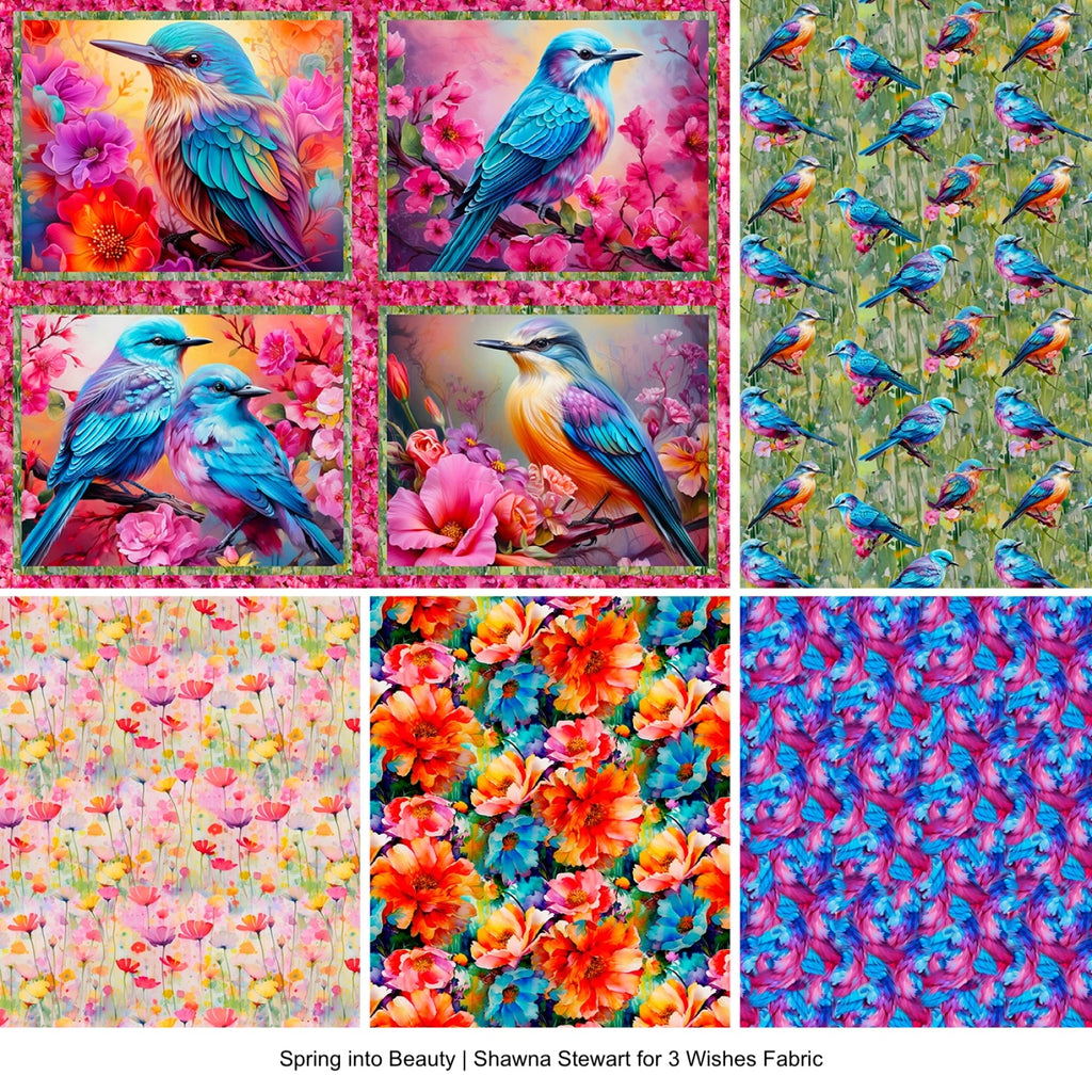 This vibrant bird perch print features colorful songbirds resting among soft green foliage with subtle floral accents. The painterly style and fresh spring palette make it a lively choice for quilts, pillows, and nature-inspired projects. Printed on 100% cotton quilting fabric.