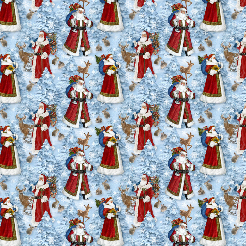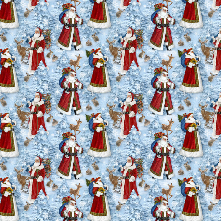 This allover scenic print features richly detailed illustrations of St. Nicholas in a snowy woodland setting, surrounded by deer, rabbits, and evergreen trees. Dressed in deep red and forest green robes, Santa carries gifts and holiday greenery through a frosty landscape of snow-covered pines. The light blue background adds a peaceful winter atmosphere, making this print ideal as a feature fabric or festive focal point in holiday quilting.