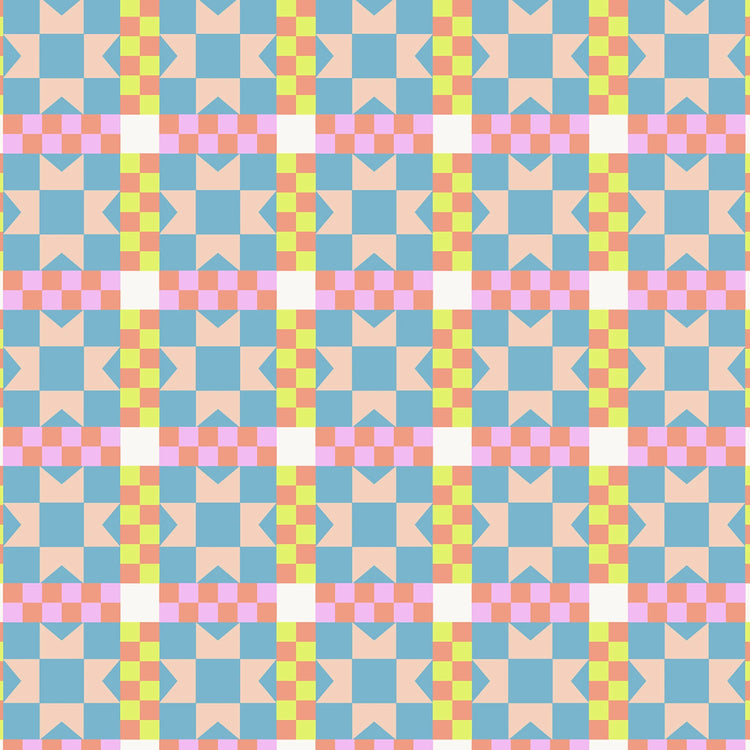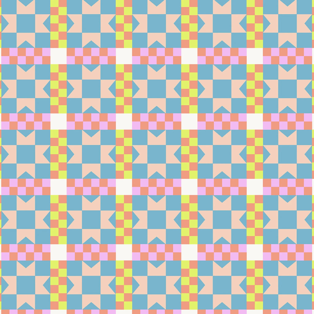 This 100% cotton fabric features a colorful cheater quilt design with star blocks and checkerboard accents in peach, cyan, pink, and lime. The repeating patchwork pattern mimics traditional piecing, giving the look of a handmade quilt without extra cutting or sewing. Perfect for whole cloth quilts, backings, or bold craft projects, this print delivers instant patchwork charm with a modern neon twist.