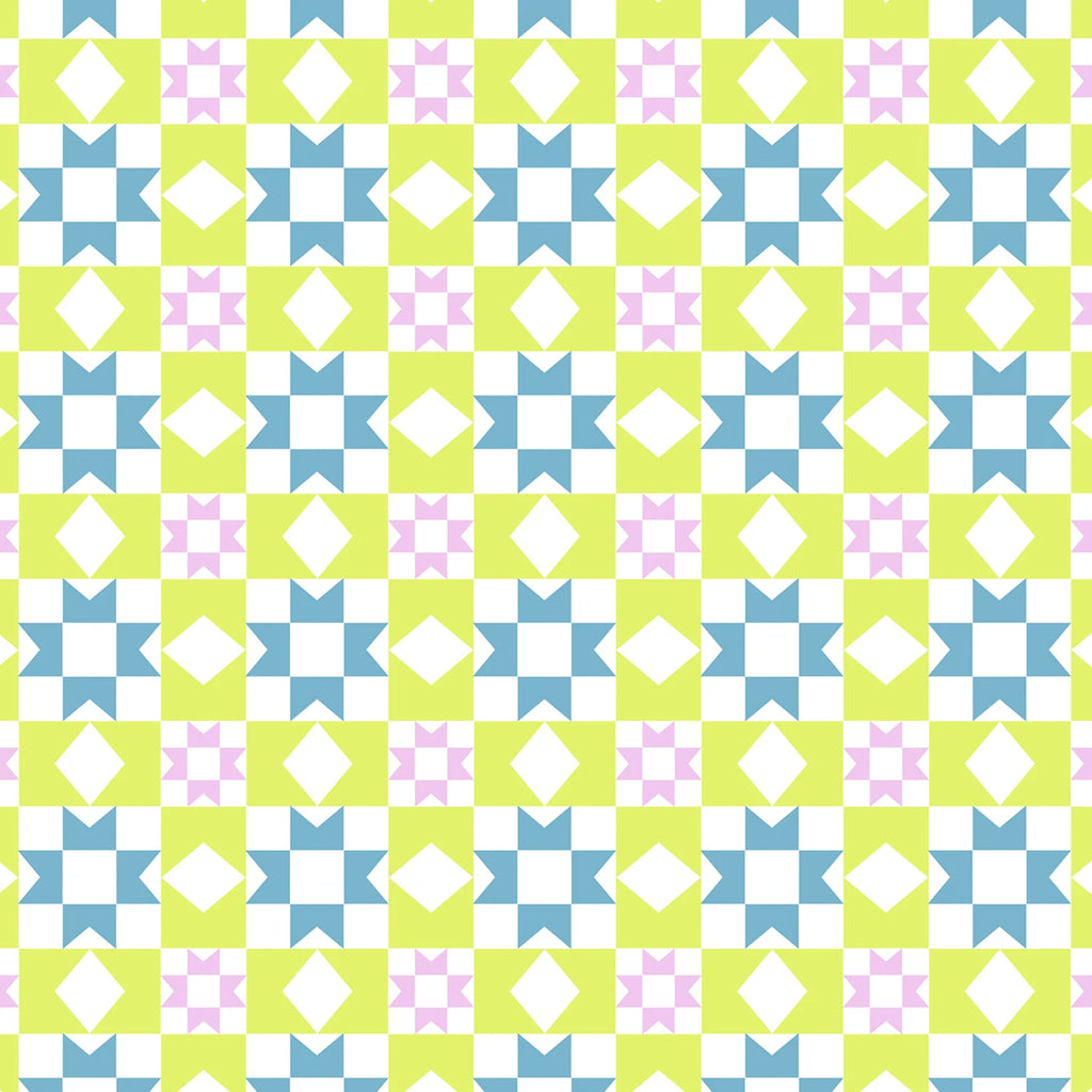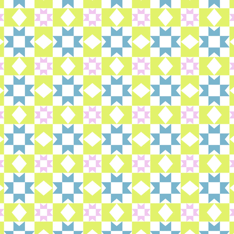 This 100% cotton fabric features a playful quilt-block inspired design with bright lime green, sky blue, and soft pink shapes arranged in a geometric grid on a crisp white background. The bold, modern color palette paired with classic block motifs makes it perfect for patchwork-style quilts, bags, and contemporary sewing projects. A fun blender with extra personality, this print brings a vibrant pop of color to any creation.