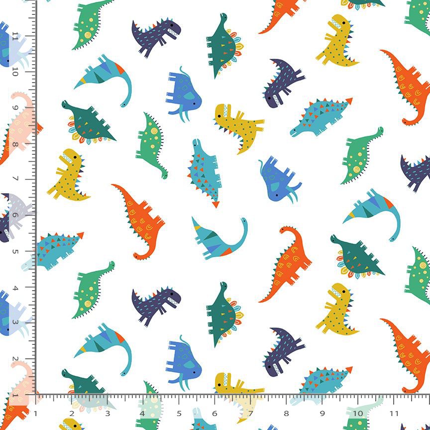 This delightful fabric features a playful design of various colorful dinosaurs scattered across a crisp white background. The dinosaurs, depicted in shades of blue, green, orange, and yellow, bring a fun and whimsical touch to any project, making it perfect for children's apparel, nursery decor, or creative quilting. The fabric's soft 100% cotton flannel texture adds comfort and warmth, ensuring it's as functional as it is charming.
