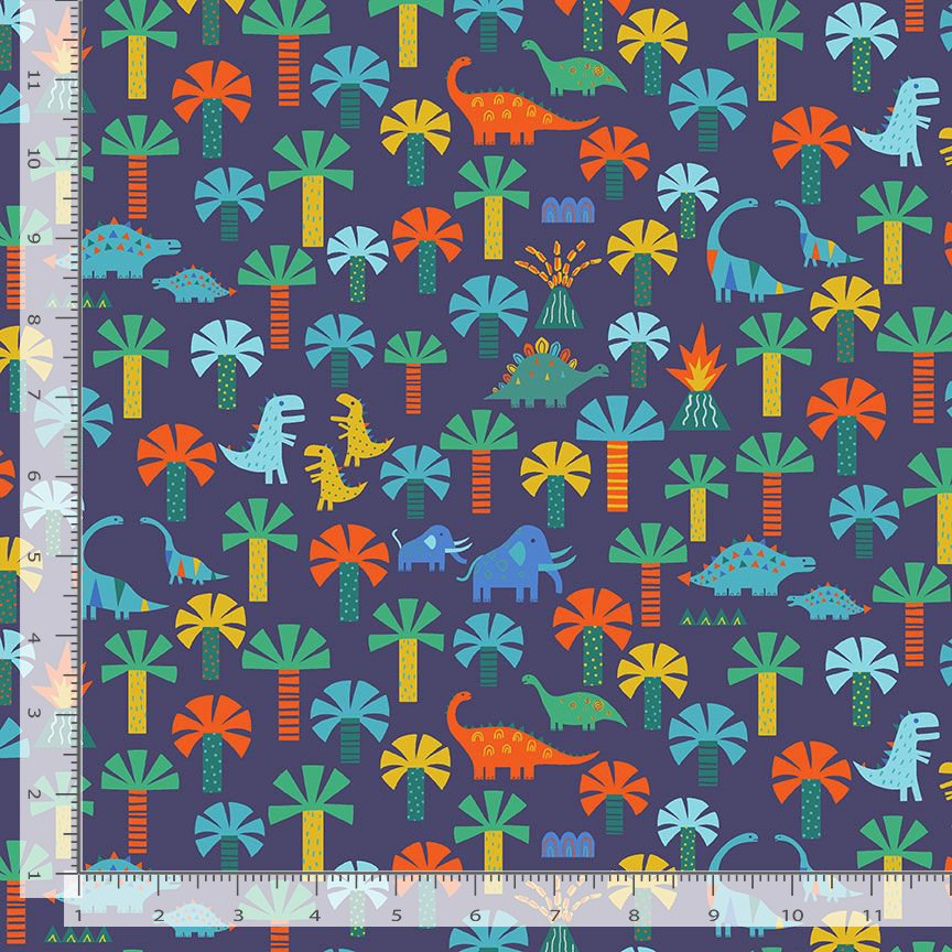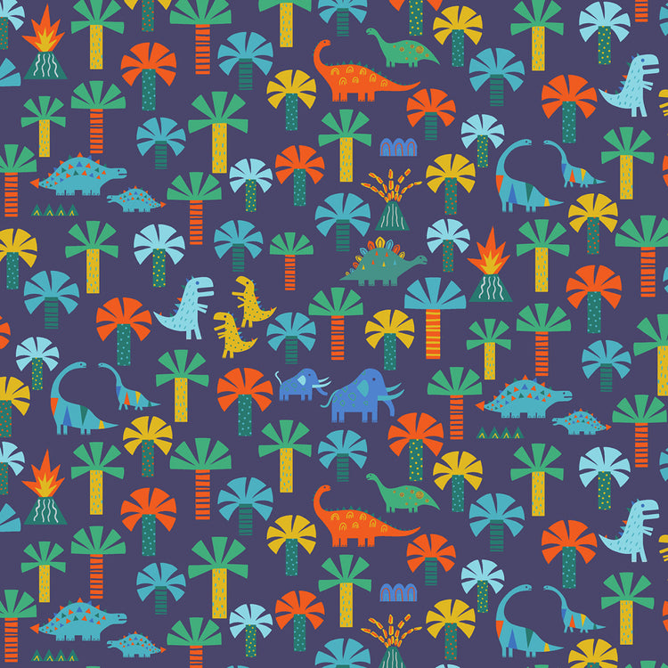 This vibrant fabric features a playful design with a navy blue background, adorned with colorful depictions of dinosaurs and lush tropical trees. The dinosaurs, in shades of blue, green, and orange, are scattered amongst the trees, which are in contrasting hues of yellow, orange, and green, creating a lively and engaging scene perfect for children's projects or themed decor. The fabric's soft 100% cotton flannel texture adds comfort and warmth, making it ideal for crafting cozy items like blankets, pajamas, or soft toys.