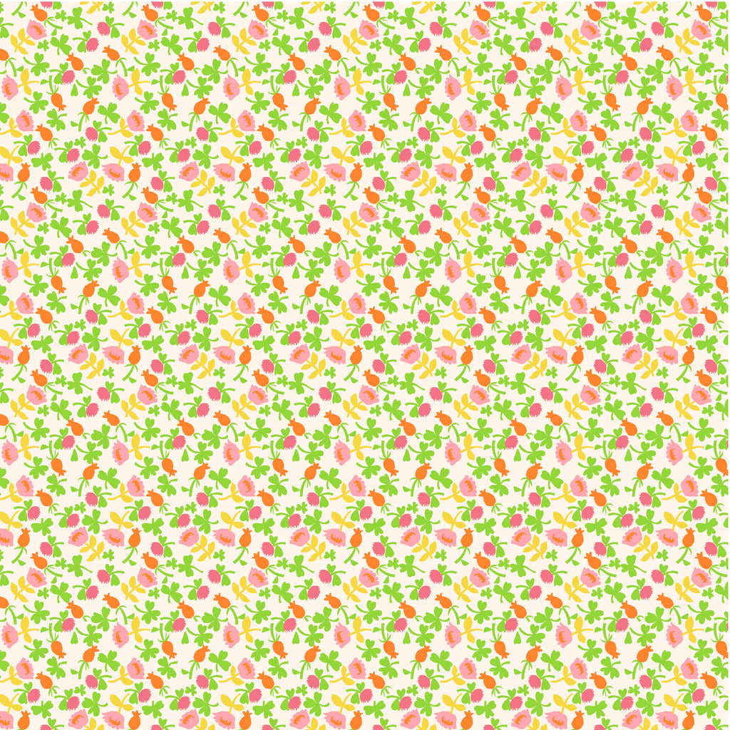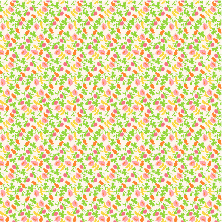 This charming fabric features a delightful pattern of small, colorful flowers and leaves in shades of pink, green, yellow, and orange, set against a soft cream background. The design creates a playful and inviting look, perfect for a variety of crafting projects from quilting to apparel. The fabric's 100% cotton composition ensures it is both comfortable and durable.