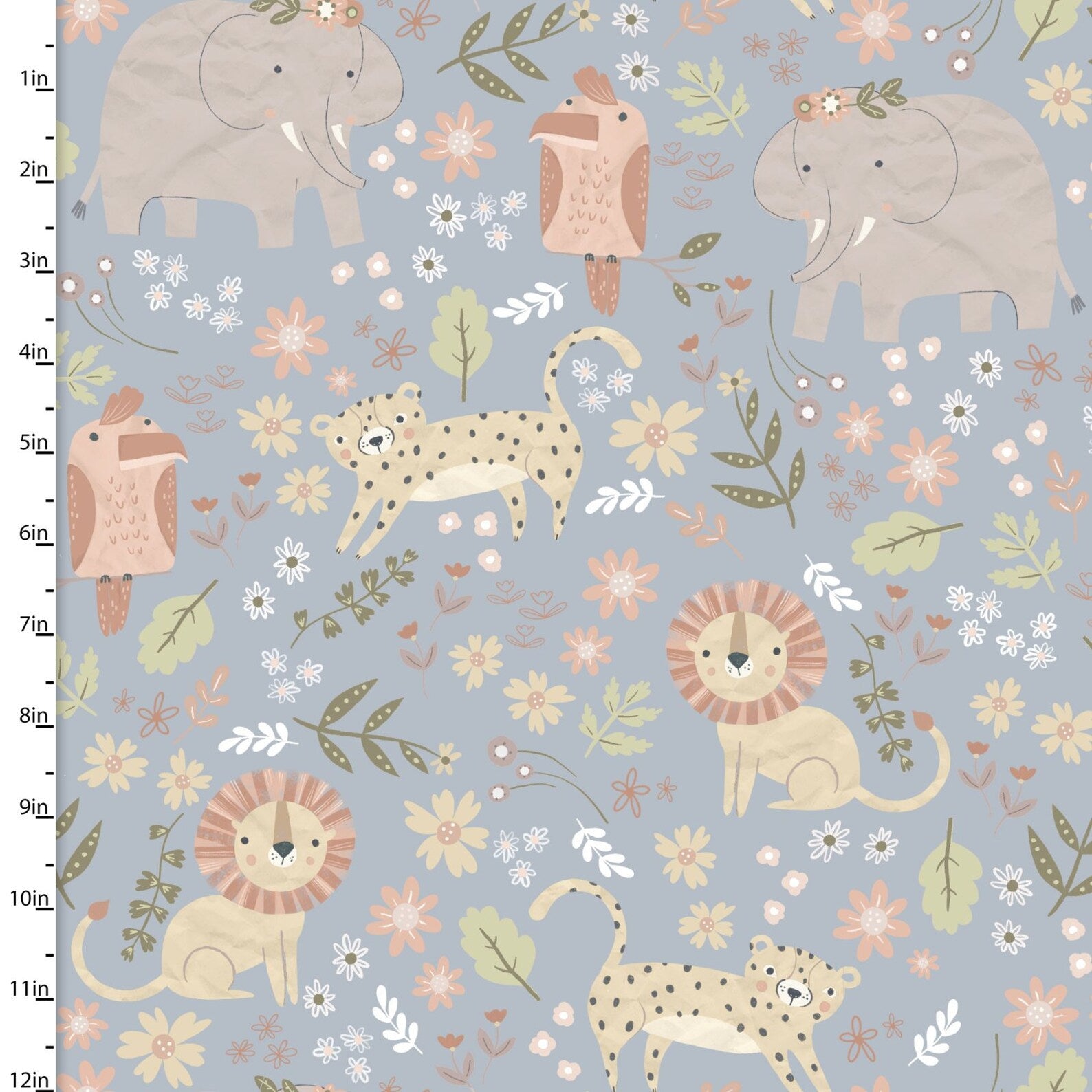 “Lions and tigers and toucans…oh my!” Sweet Savanna by Elaine Kay for 3 Wishes is a 5-piece collection where you will find a mix of safari and jungle animals set against a neutral color palette of blues, grays, and blush. This cotton print features animal friends on a blue background.