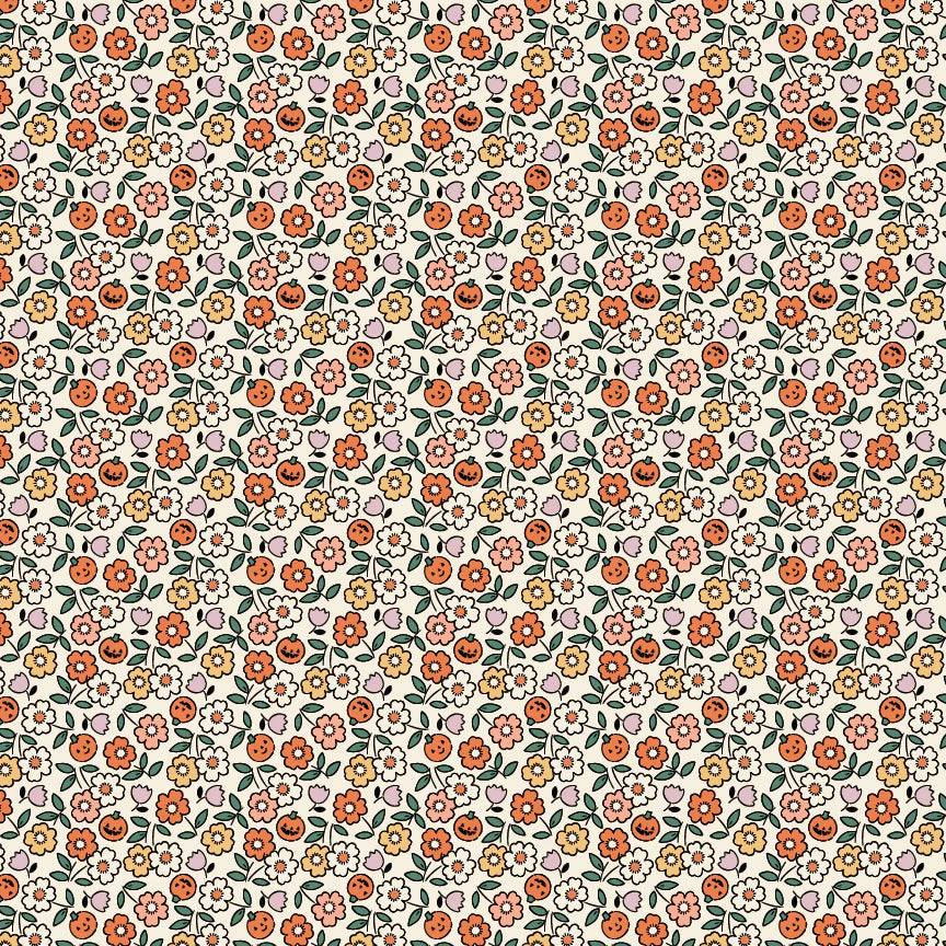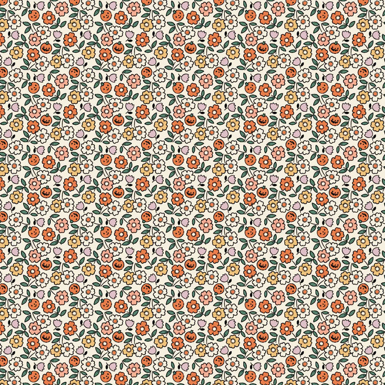 This charming print features small cheerful jack-o-lanterns scattered among blossoms on a natural white background.