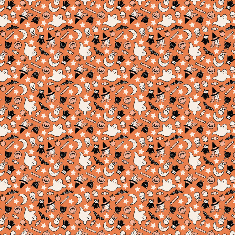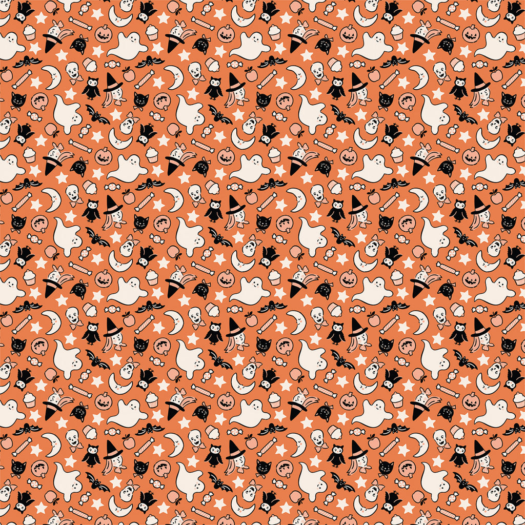 This print features treats and candies on an orange background, along with witches, ghosts, owls, bats, pumpkins, skulls, moons and stars.