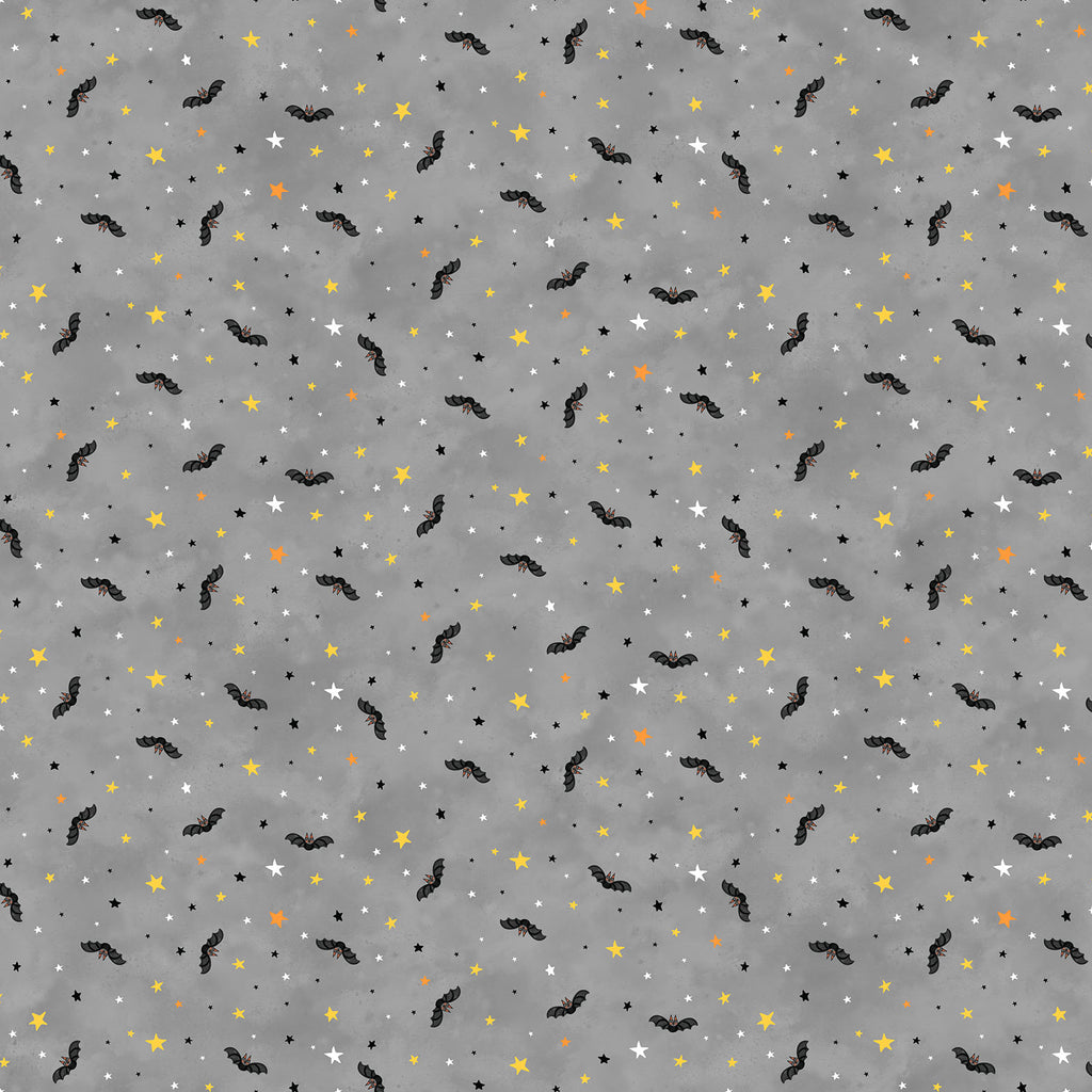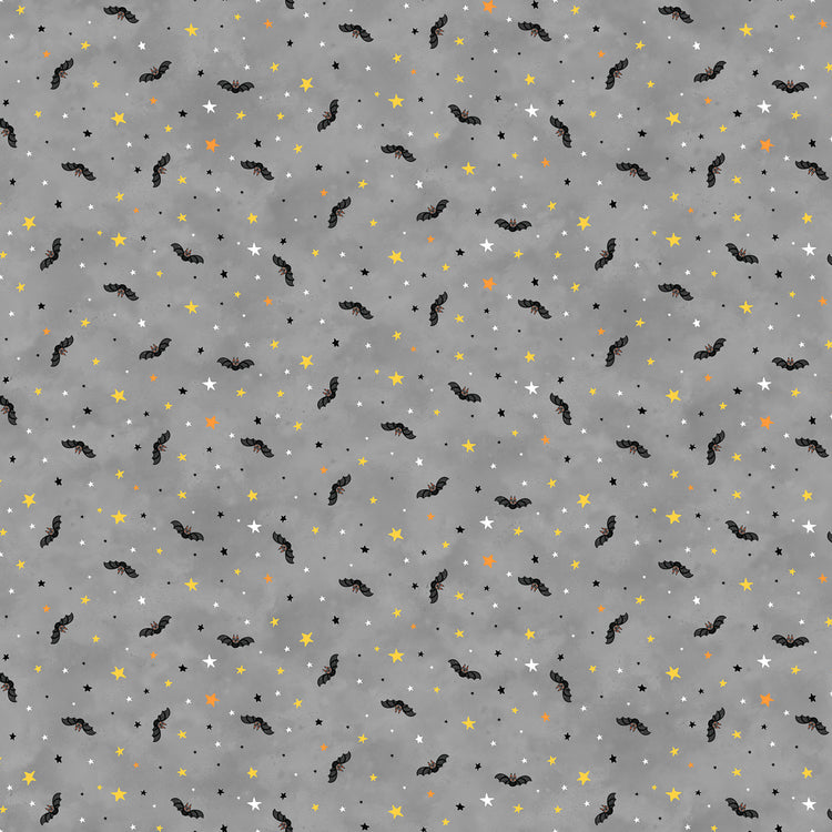 Bats flutter across a soft gray background dotted with orange, yellow, black, and white stars. A great coordinating blender for Halloween quilts and accessories, with just enough character to stand on its own or support a more detailed focal print.