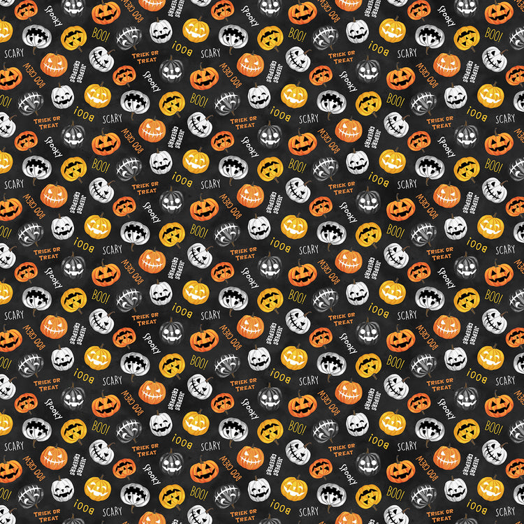 This playful Halloween print features a dense scatter of jack-o'-lanterns and spooky phrases in orange, yellow, gray, and white on a black background. This fabric adds fun texture and festive flair to any Halloween project.