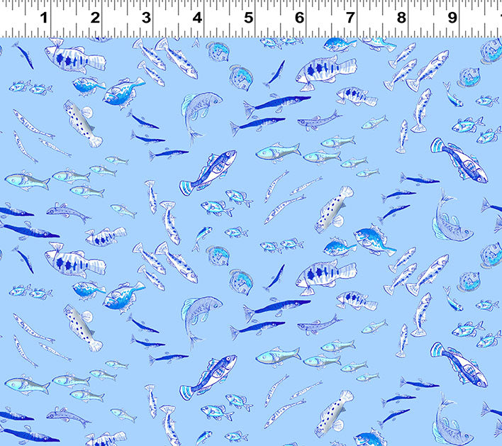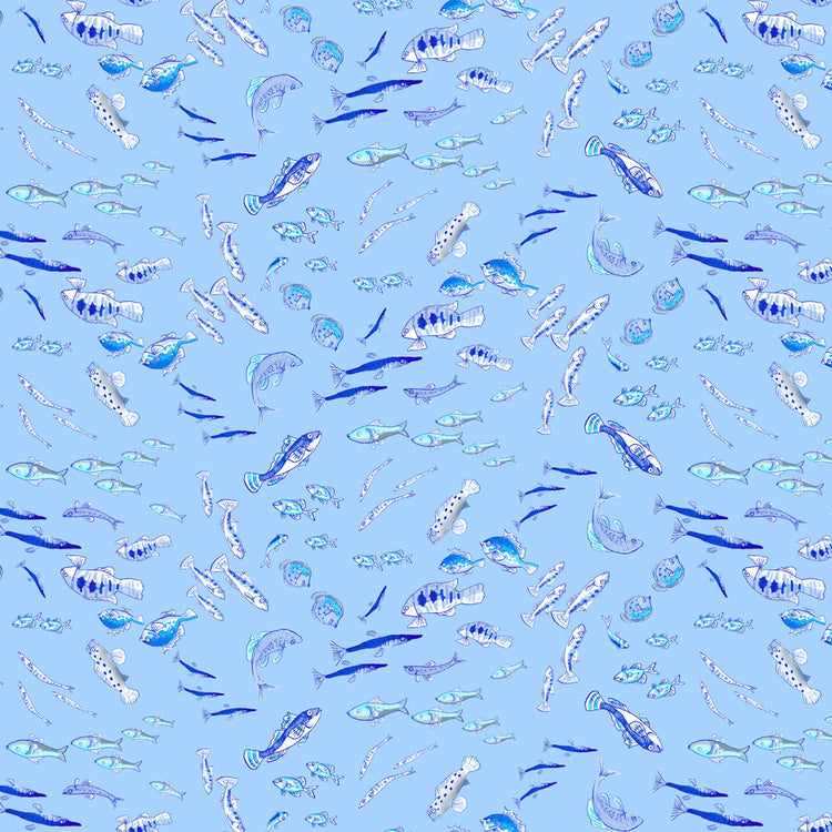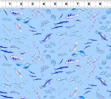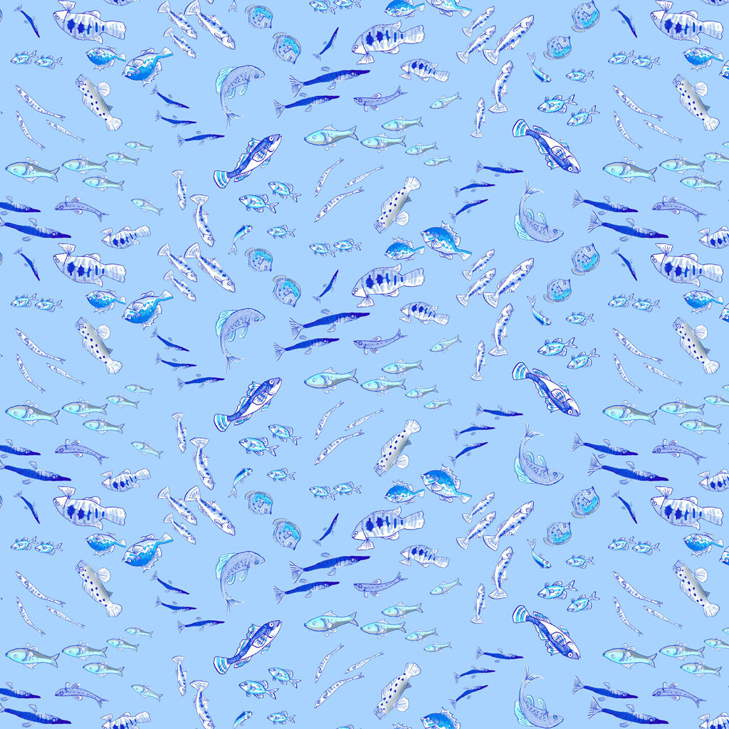 This print features fish scattered on a light blue background. 100% Cotton. 43/44" Wide.